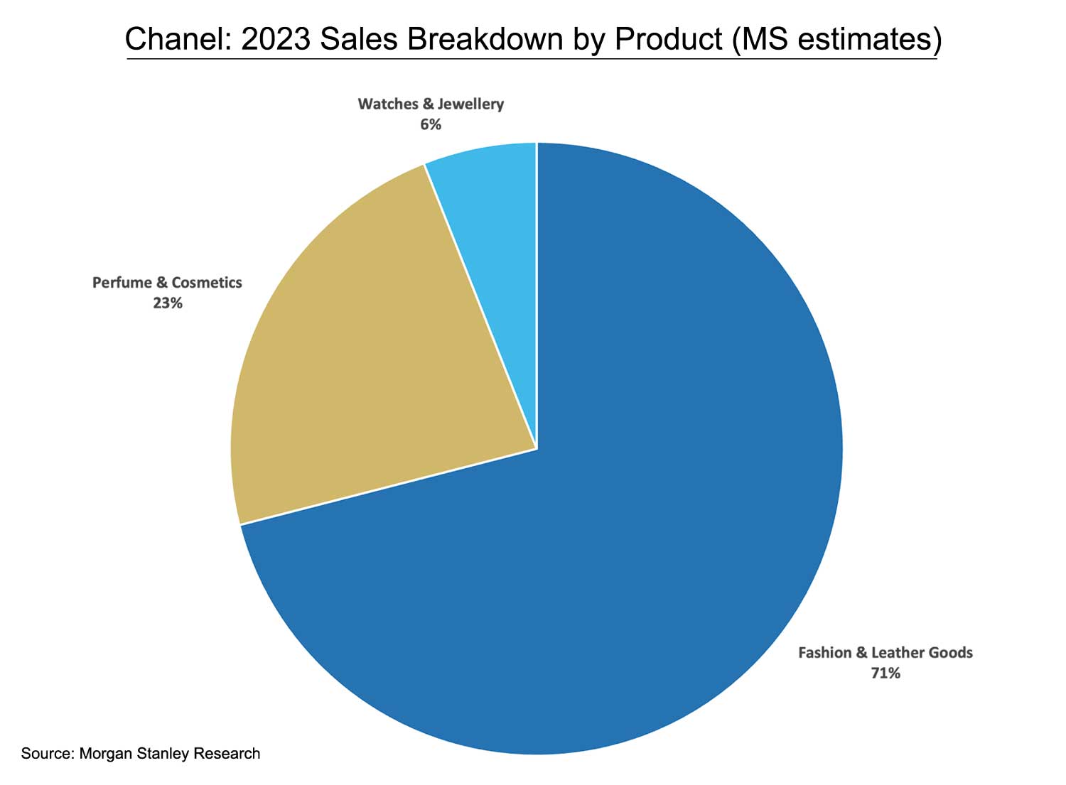 Looking at Morgan Stanley’s estimates for 2023, Chanel sold for CHF 400m watches putting the brand in the 22nd rank of the Swiss watch industry. Compared with Hermès at CHF 593m, it is trailing but doing much better than Louis Vuitton’s watch category at CHF 162m. The watch division is a marginal sales and margin contributor — ~2% of the brand’s overall sales of almost USD 20B last year — but that doesn’t mean that it doesn’t bear a major growth potential.