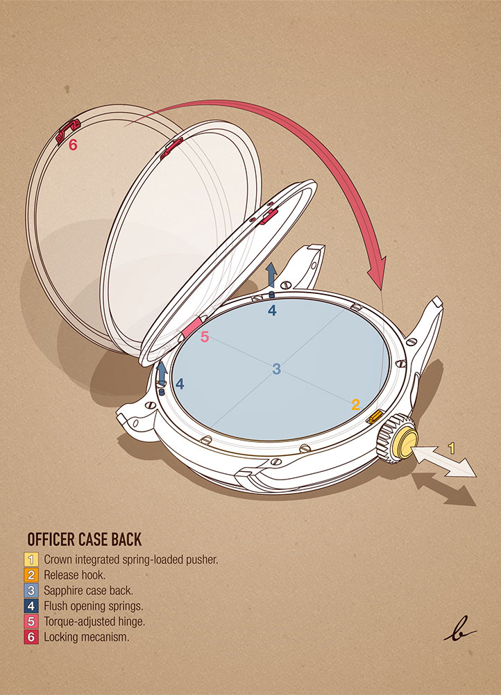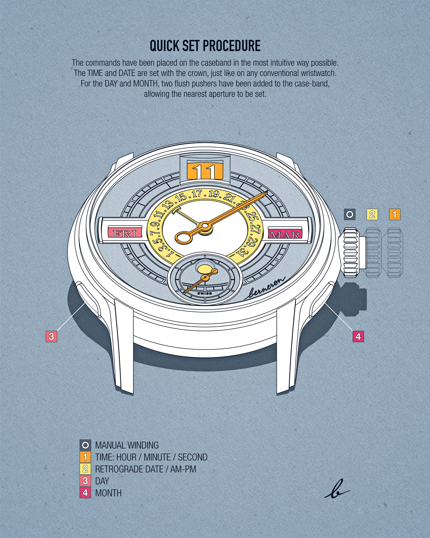 The main event, however, is how easy it is to set the calendar. Time and date are adjusted in the usual way, through the crown, as on any ordinary watch. The day and month are advanced by a pair of pushers in the case band each one directly linked to its nearest aperture. This makes what is usually a fiddly, tool-dependent exercise into something you can do in seconds, with no more ceremony than pressing a button.