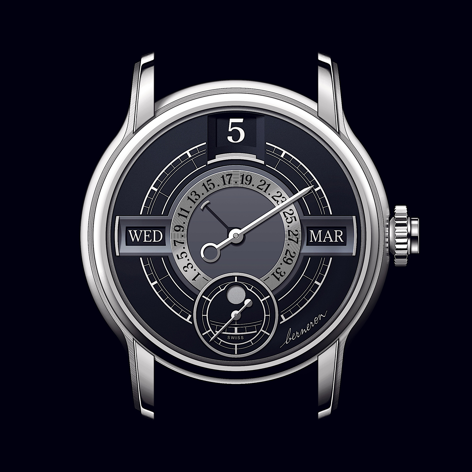 A casual glance at the caliber makes clear that its arrangement is anything but conventional. The gear train, for one, is nowhere in sight and the winding train dominates the rear view of the movement. Berneron designed it to echo the cross-shaped layout of the dial. Power management was an obvious challenge; at its peak load, the watch must drive four jumps and a retrograde action at midnight on the last day of the month. The energy for each indicator is gradually accumulated and stored locally in a return spring by means of a snail cam, rather than being drawn directly from the mainspring at the moment of the jump, which would otherwise sap amplitude.