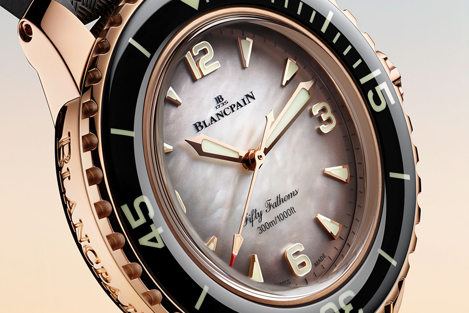 Then there are the mother-of-pearl models. One features a smoky black dégradé dial in red gold; the other shimmers in petal pink, housed in brushed titanium. Powered by calibre 1153 (a close sibling of the 1150), these watches add a bold new character to the Fifty Fathoms line — emotionally expressive, unapologetically elegant, and a clear tribute to Blancpain’s female collectors and its Ocean Commitment program. These aren’t limited editions, but they do feel special — not least thanks to their 300 meter depth-rated cases, domed sapphire bezels, and beautifully textured straps.