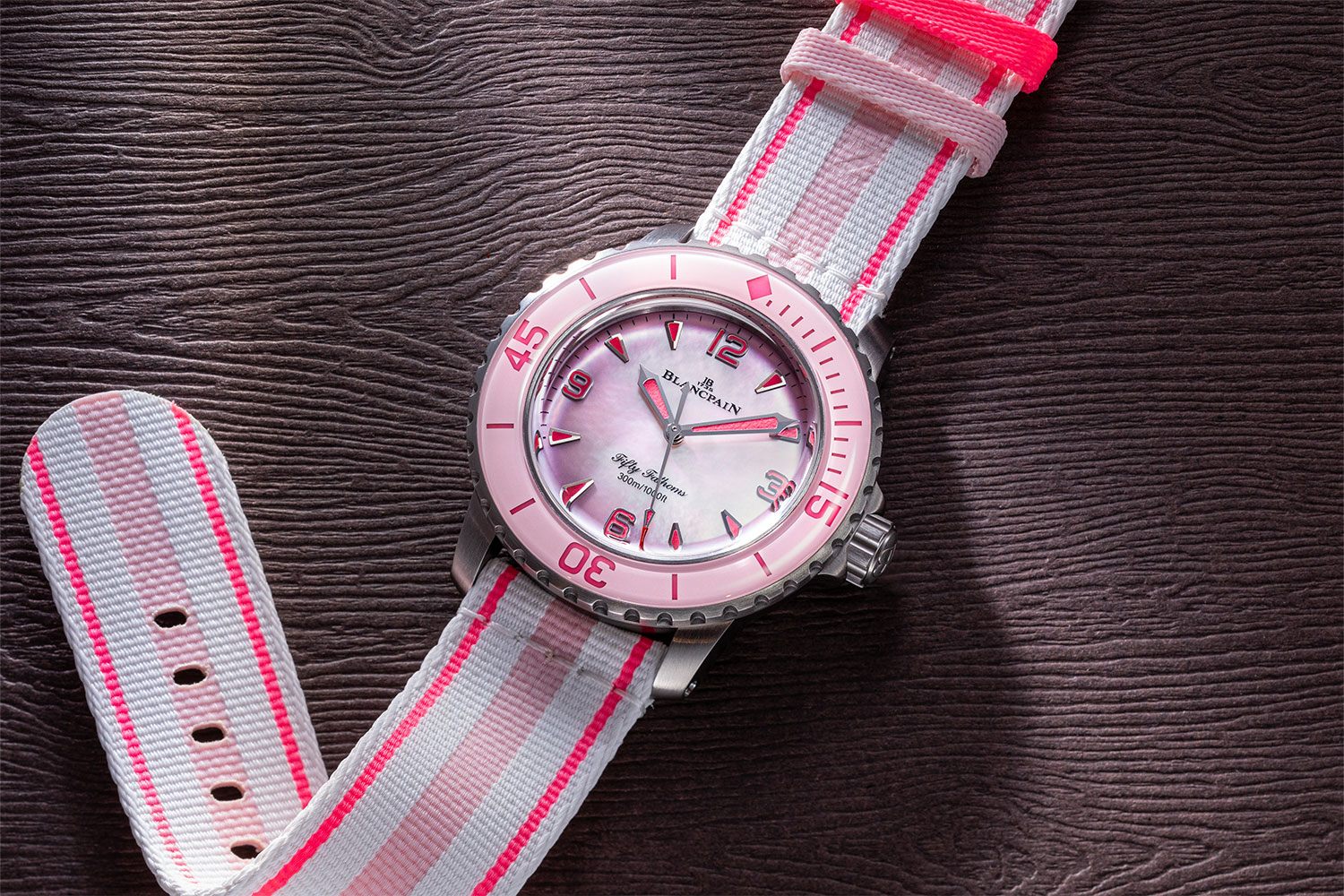 Fifty Fathoms Automatique in tonal pink and white, with a complementary pink mother-of-pearl dial with a titanium case. (Image: Revolution ©)