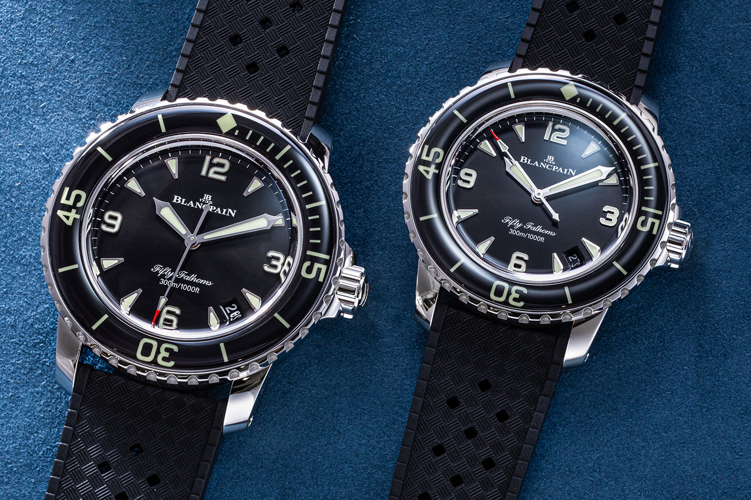 Blancpain Fifty Fathoms Automatique Ref. 5007 in 38mm (right) versus 45mm (left). (Image: Revolution ©)