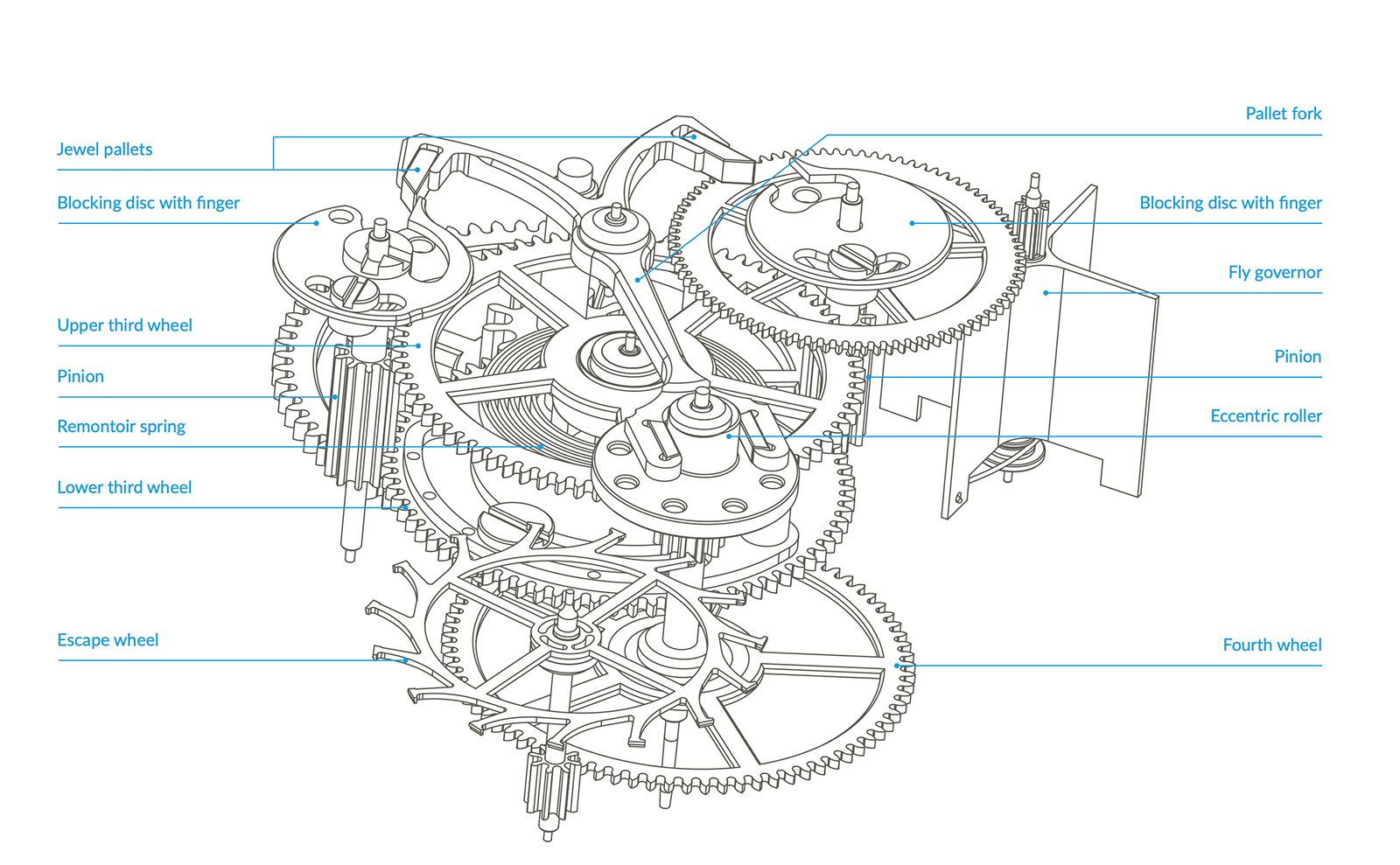 Once per minute, the fourth wheel brings an eccentric cam into position, causing a control lever to pivot. This motion lifts one of the blocking fingers from its pallet, momentarily releasing the lower third wheel. This causes the lever to pivot, disengaging the pallet from one locking tooth while simultaneously engaging the other. In that brief window, the lower third wheel is freed and able to rotate under mainspring torque, re-tensioning the remontoir spring. This sudden motion also drives the display train and jumping digital discs – minute units, tens-of-minutes and hours if needed – before the wheel is locked again.