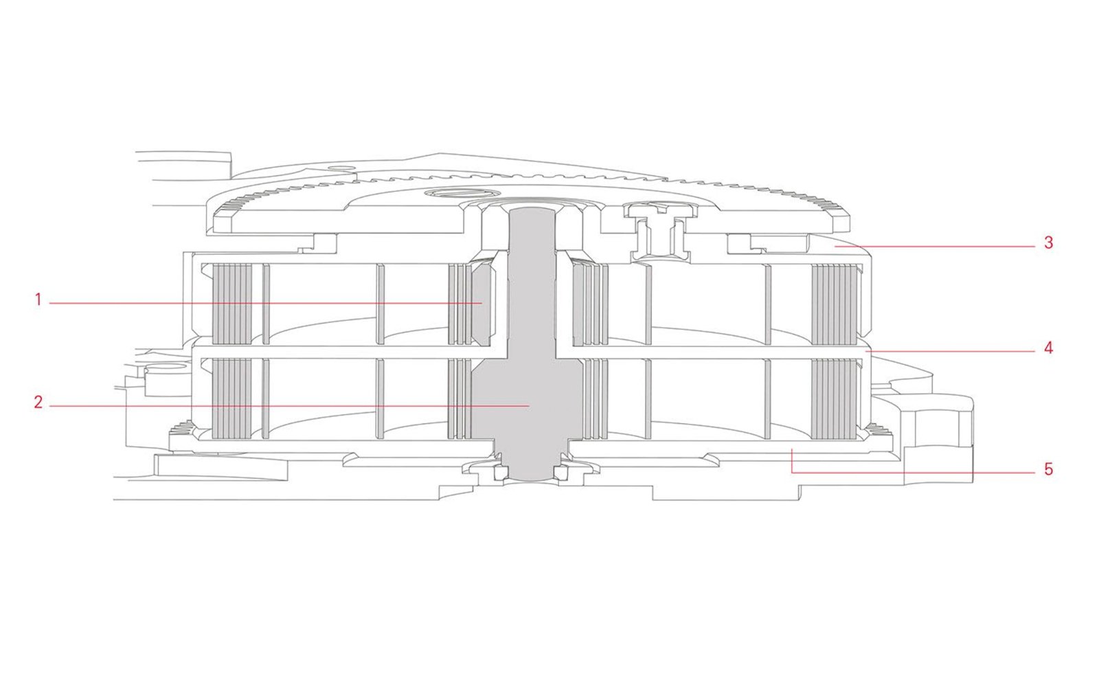 Winding is transmitted through the upper barrel drum, which is fixed to the ratchet wheel, while power is delivered to the gear train via a wheel (5) mounted directly on the lower spring arbour. The result is a compact, efficient system that maximises both stability and energy delivery.