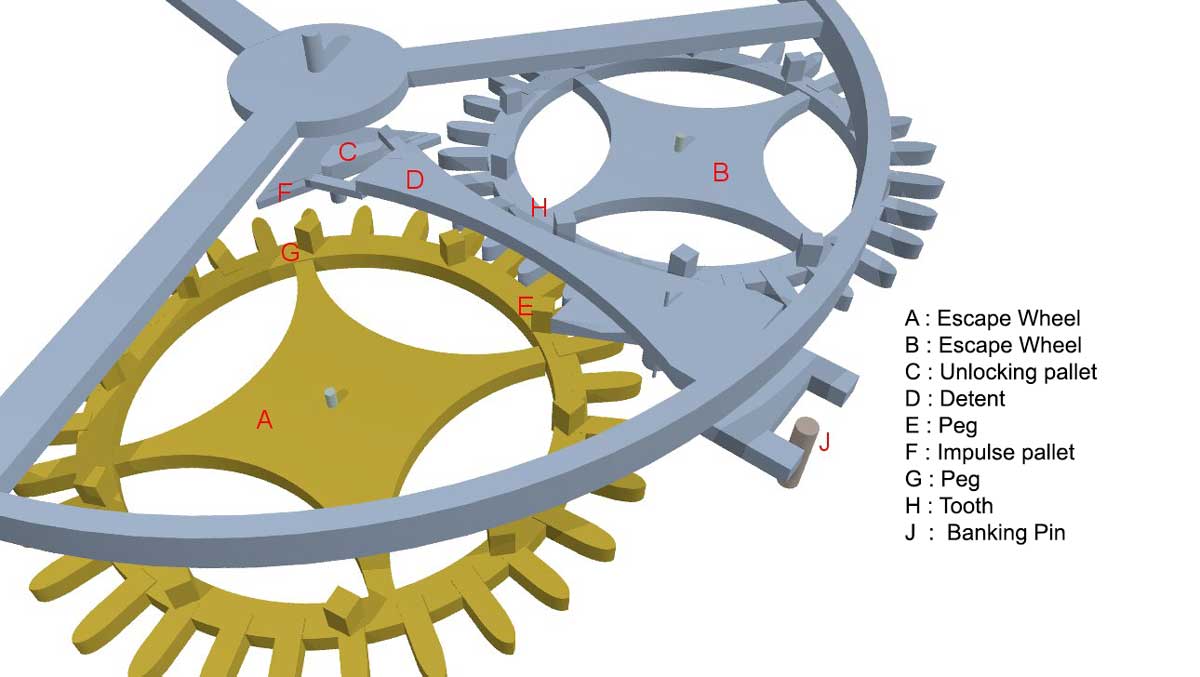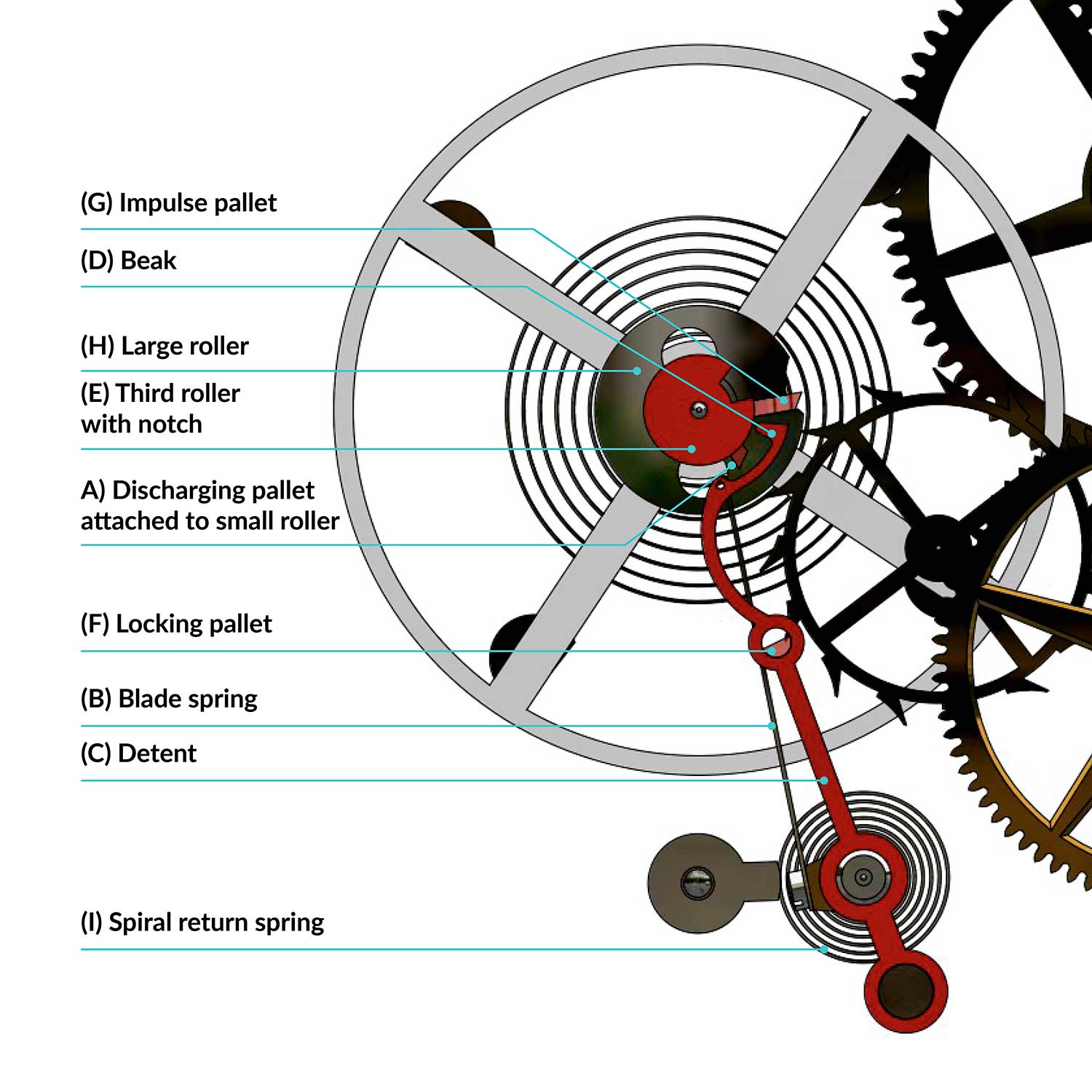 During the descending supplementary arc of the balance, the discharging pallet (A) on the small roller, comes into contact with a fine blade spring (B) and displaces the detent (C). The beak (D) penetrates the notch on the third roller (E) and the locking pallet (F) on the detent unlocks the escape wheel, allowing it to advance one tooth forward. Another tooth on the escape wheel falls onto the impulse pallet (G), which is part of the large roller (H), and transmits energy to the balance to make its ascending supplementary arc. Now the beak has been released from the notch and remains in proximity to the periphery of the third roller. The safety mechanism here refers to the beak briefly pressing against the periphery of the third roller in the event of a shock, stopping the detent, which is returned to its resting position by a spiral spring (I) whenever it is displaced.