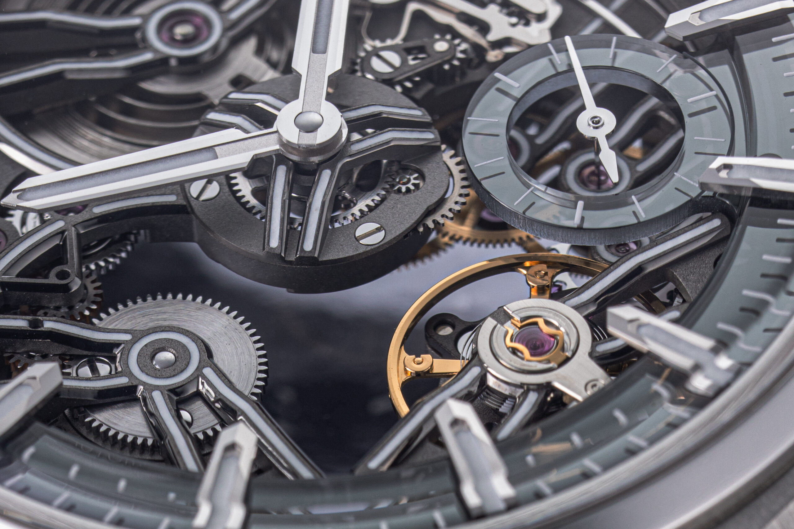 The idea for this watch was to use the Czapek Antarctique Révélation as a canvas and infuse it with a distinct Revolution twist. The Antarctique Révélation is already a stunning timepiece — showcasing a fully open-worked design with no traditional dial, only a subtle gray chapter ring around the periphery that carries the hour markers and minute track. Czapek masterfully used varying shades of gray and contrasting finishes across the movement bridges and surfaces to enhance legibility and add a sense of visual depth.