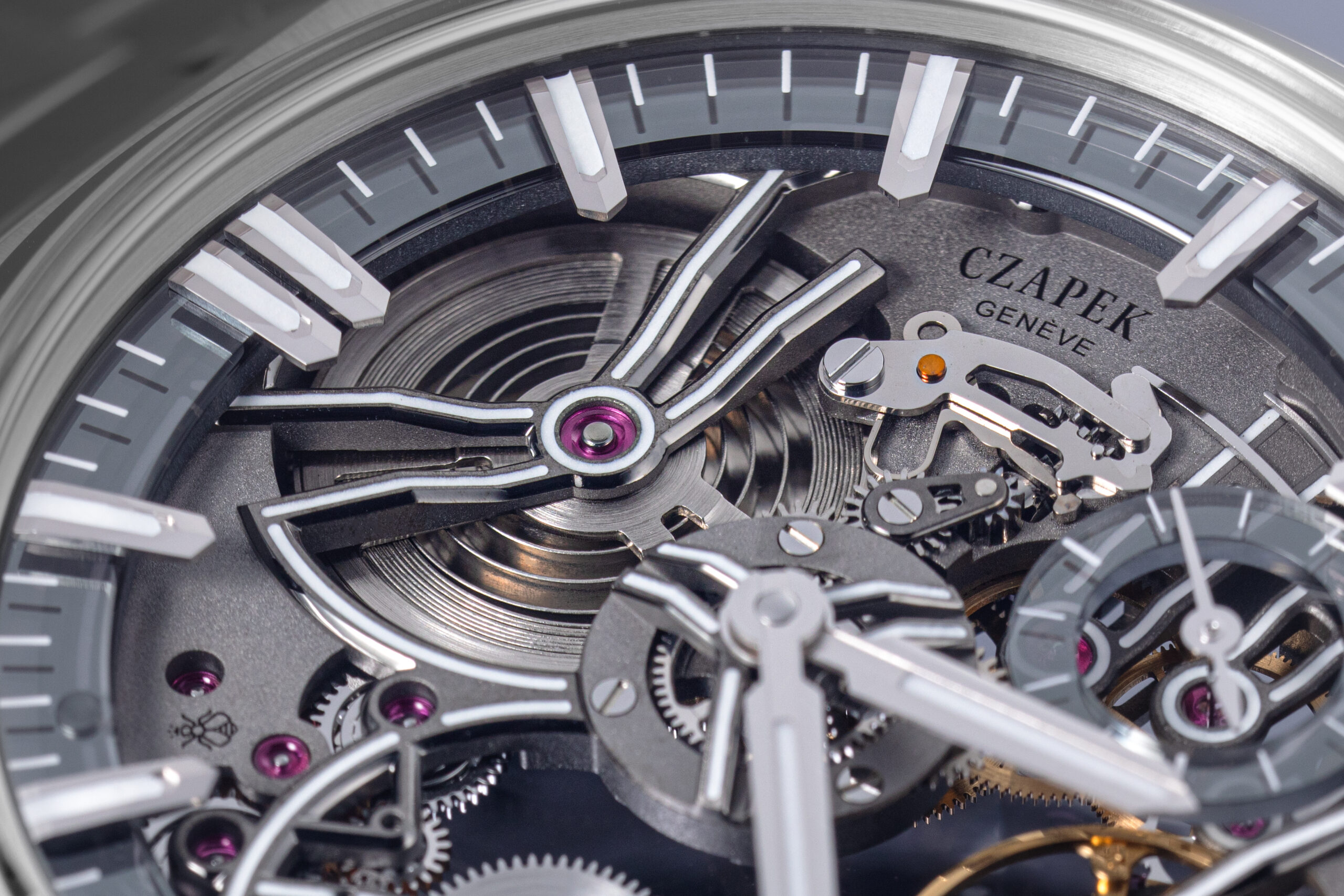 The movement inside is no slouch either — the automatic Czapek Caliber SXH7 is a completely different creation from the earlier SXH5 used in the standard three-hand Antarctique models. As expected, it’s fully skeletonized, with much of the bridge material strategically removed to reveal the intricate mechanics beneath.