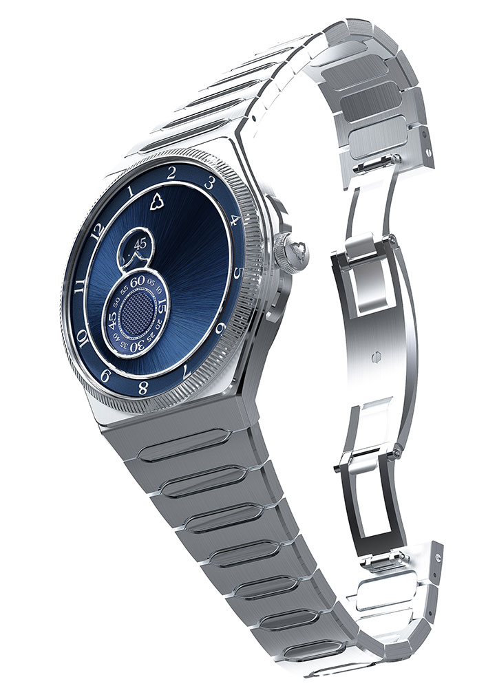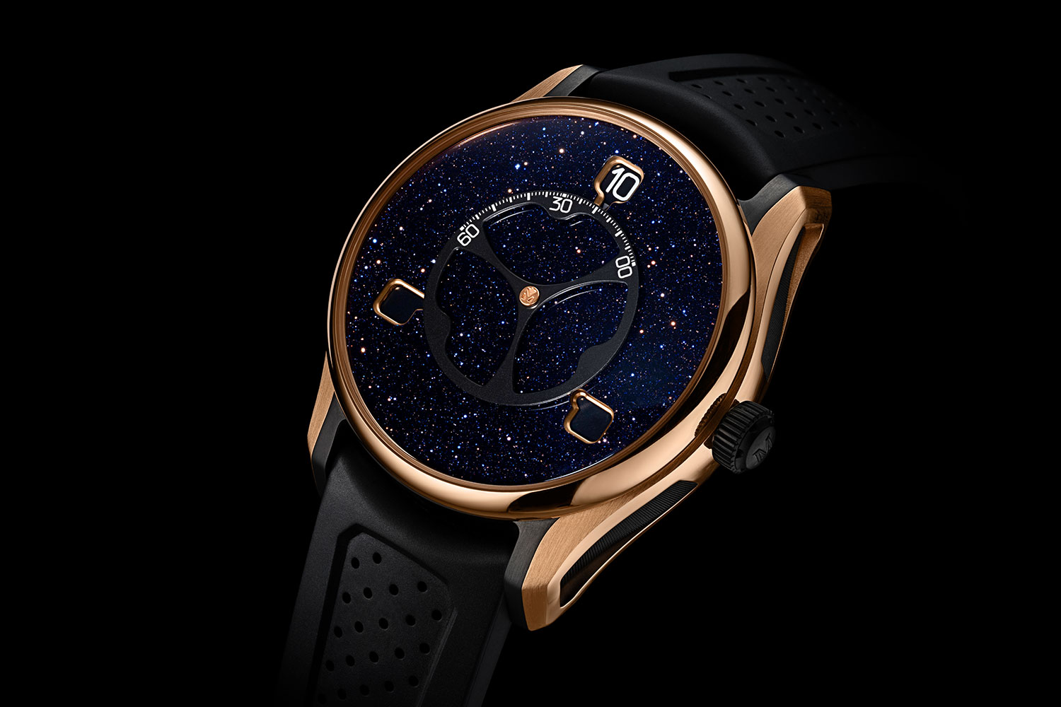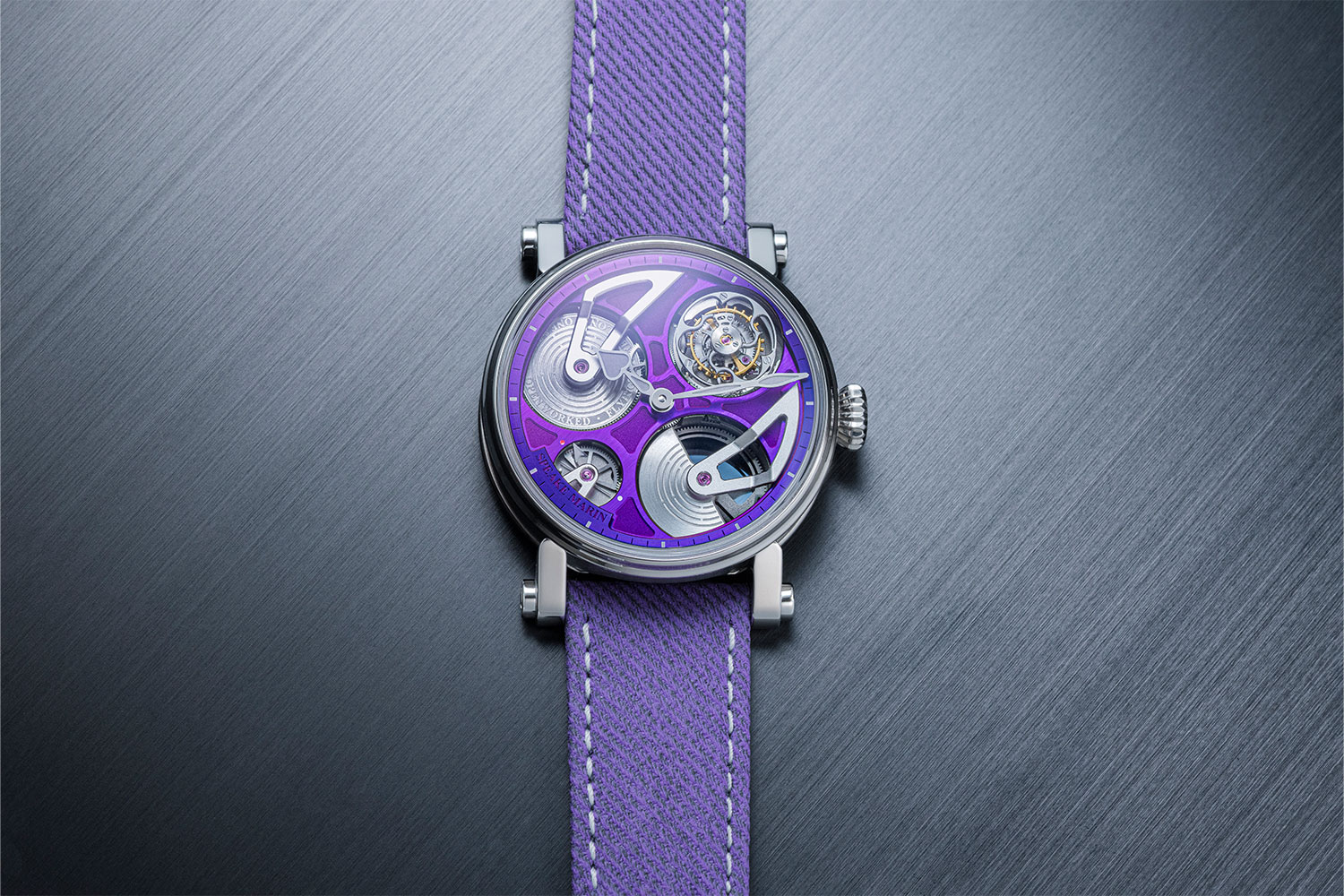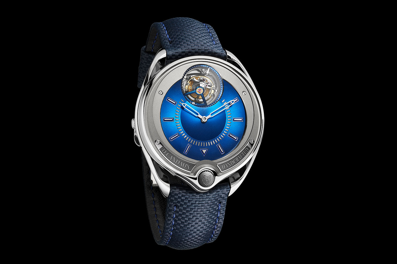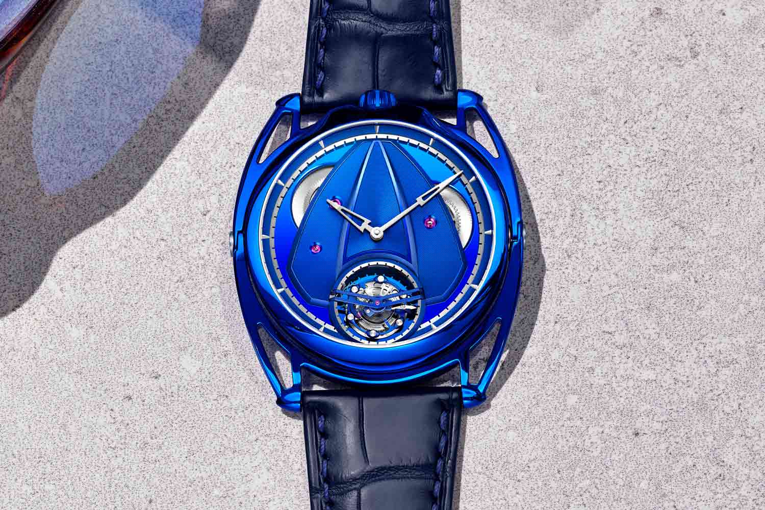 The 44mm Grade 5 titanium case is fully hand-polished — a first for the independent watchmaker — and paired with an anodized blue titanium dial. The watch is limited to eight pieces.