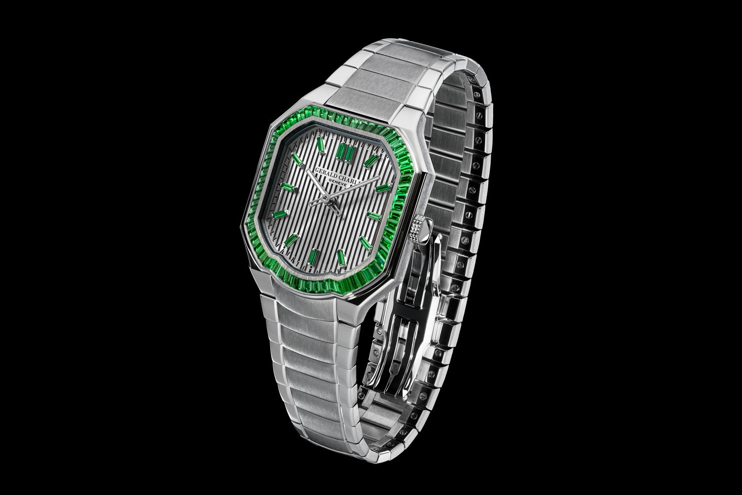 For Geneva Watch Days 2025, Gerald Charles revives one of founder Gérald Genta’s very last designs, the Masterlink Gem-Set. The story goes that a royal family in Sarawak, Malaysia, commissioned a watch that featured not only an asymmetrical case but also an unusually asymmetrical bracelet, with flat links on the 12 o’clock side and curved links on the 6 o’clock side to match the case. The original was fully set with diamonds and rubies. Today, that style returns with fewer diamonds but striking options in blue sapphire, red sapphires, or tsavorite.