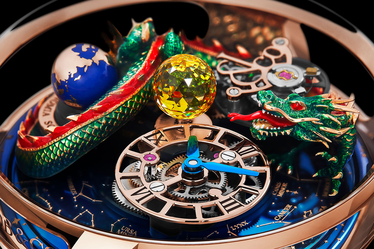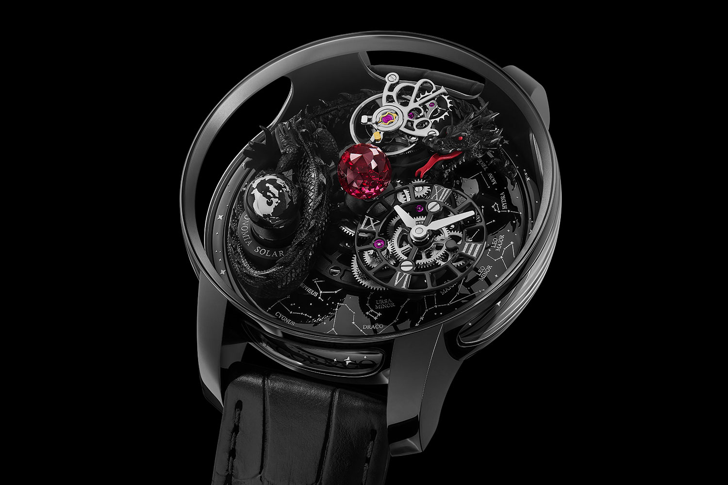 Available in rose gold or black titanium, each version ties into its color theme with a celestial backdrop of gold-lettered constellations. Taking center stage is a hand-sculpted rose gold dragon. Each dragon reportedly takes nearly three weeks to complete: cast in solid gold, engraved and polished over two weeks, then hand-painted for another. The result is a sculpture of scales, claws, and flowing hair that winds around the Astronomia Solar’s three-dimensional movement, visible from every angle through a domed sapphire case.