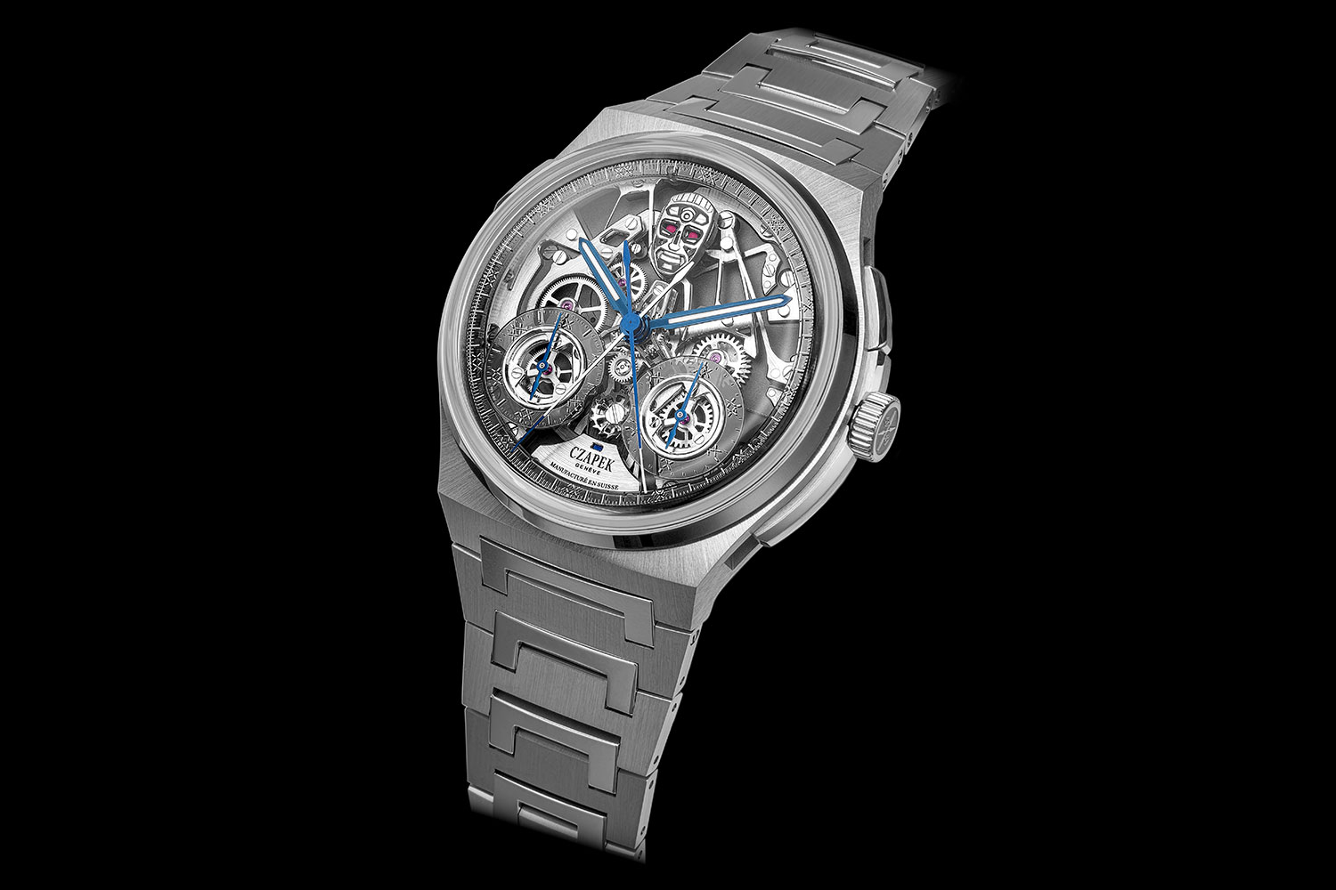 Czapek & Cie looked to Karel Čapek’s 1921 play R.U.R. – Rossum’s Universal Robots to present the new Antarctique Rattrapante R.U.R.. On the dial, the split-seconds chronograph takes center stage thanks to Calibre SXH6, developed with Chronode’s Jean-François Mojon. Alongside the rattrapante mechanism that’s duly exposed, a miniature titanium robot is perched above the chronograph column wheel. Crafted by MD’Art, its neon-painted eyes change colour with each click of the pushers.