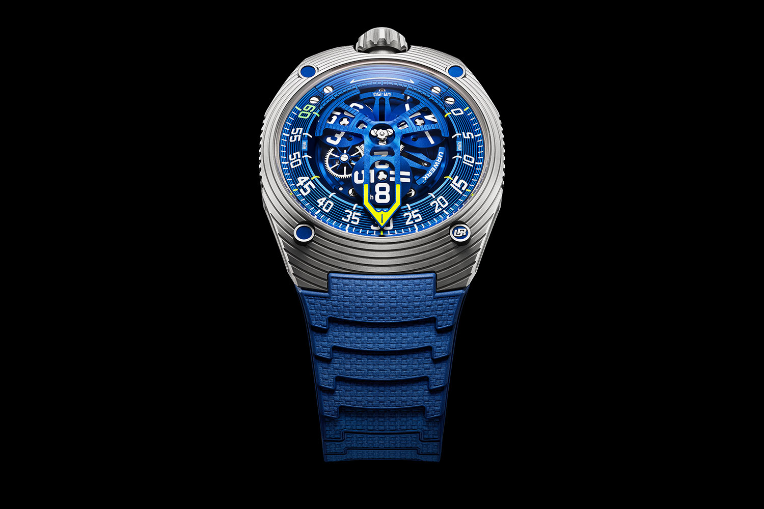 Urwerk freshens up the UR-150 in the newly named Blue Scorpion with a vivid blue coat and neon yellow accents For a quick refresher: three rotating hour satellites orbit on a flying carousel. A retrograde hand frames the active satellite, sweeping across a 240° arc from minute 0 to 60 before snapping back in just 1/100th of a second all while the hour satellites rotate in unison. All of this happens on the self-winding UR-50.01 caliber that’s equipped with double-turbine winding and a 43-hour reserve.