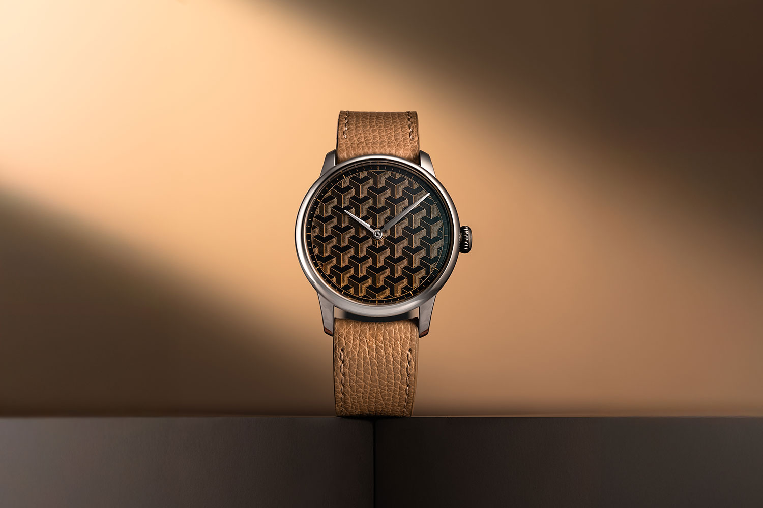 Using a machine once designed to bond microchips, the duo repurposed it to “embroider” gold. Each dial requires over 2,300 gold threads and 3,600 solder points, laid down one by one. The result is a hypnotic cube motif that shimmers with depth. Housed in a 39 mm stainless steel case, the Fil d’Or is limited to just 99 pieces.