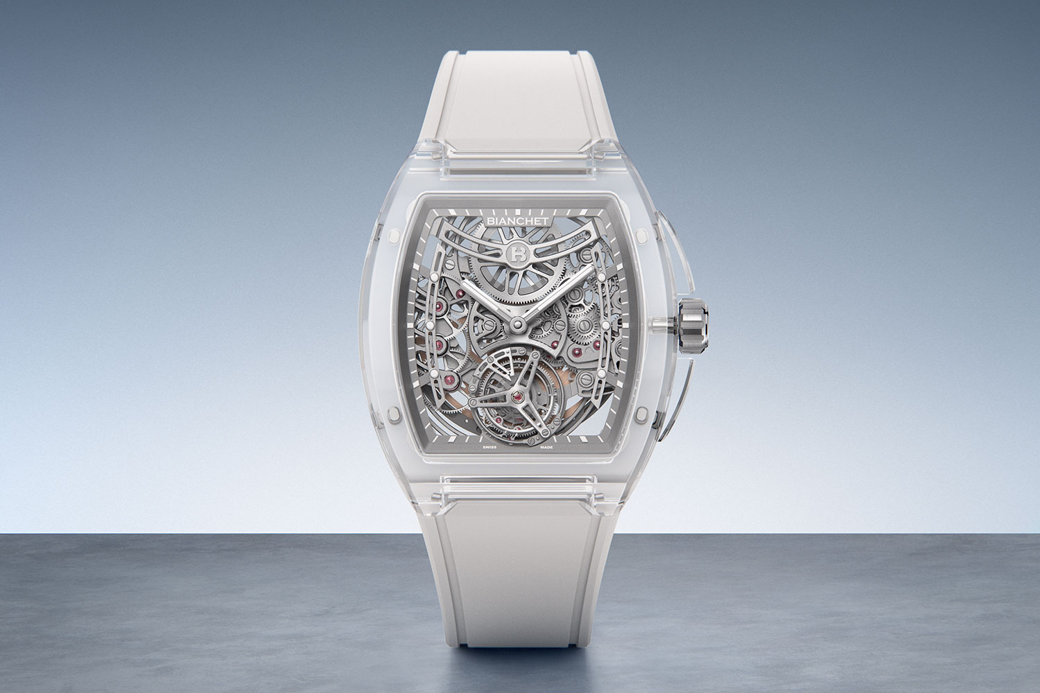 Bianchet introduces UltraFino Sapphire, a full-sapphire reinterpretation of its ultra-thin skeleton tourbillon. At 9.8mm thick, it lays claim to be among the slimmest full-sapphire watches on the market. The curved tonneau case frames the flying tourbillon within the UT01 caliber, where a gold rotor has been shaped into twelve interlacing Fibonacci spirals. The watch is priced at CHF 85,500 (excl. taxes).