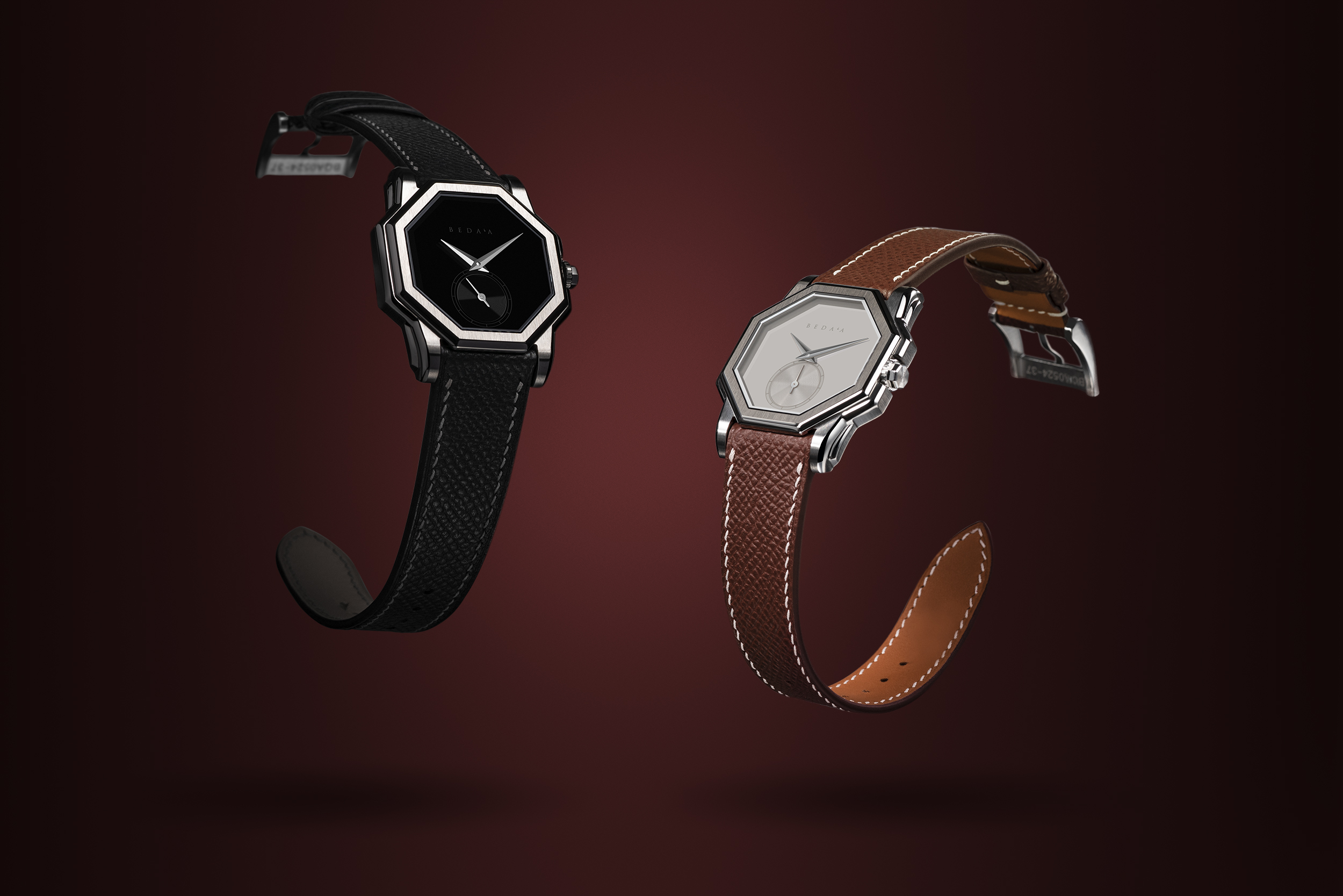 The Beda’a Angles as we know it now has a beating, mechanical heart. In transforming the piece from quartz to house the manual-winding ETA 7001, much of its octagonal architecture was kept, adding just 0.7mm in thickness. The Angles Mecaline maintains the clean, refined minimalism of the quartz original; no hour markers clutter the dial. The only addition is the small seconds display, styled in a sector design with semi-matte sunray or circular finishing. Two dial options debut at launch — black or taupe-grey — each housed in a 37mm case and paired with a leather strap.