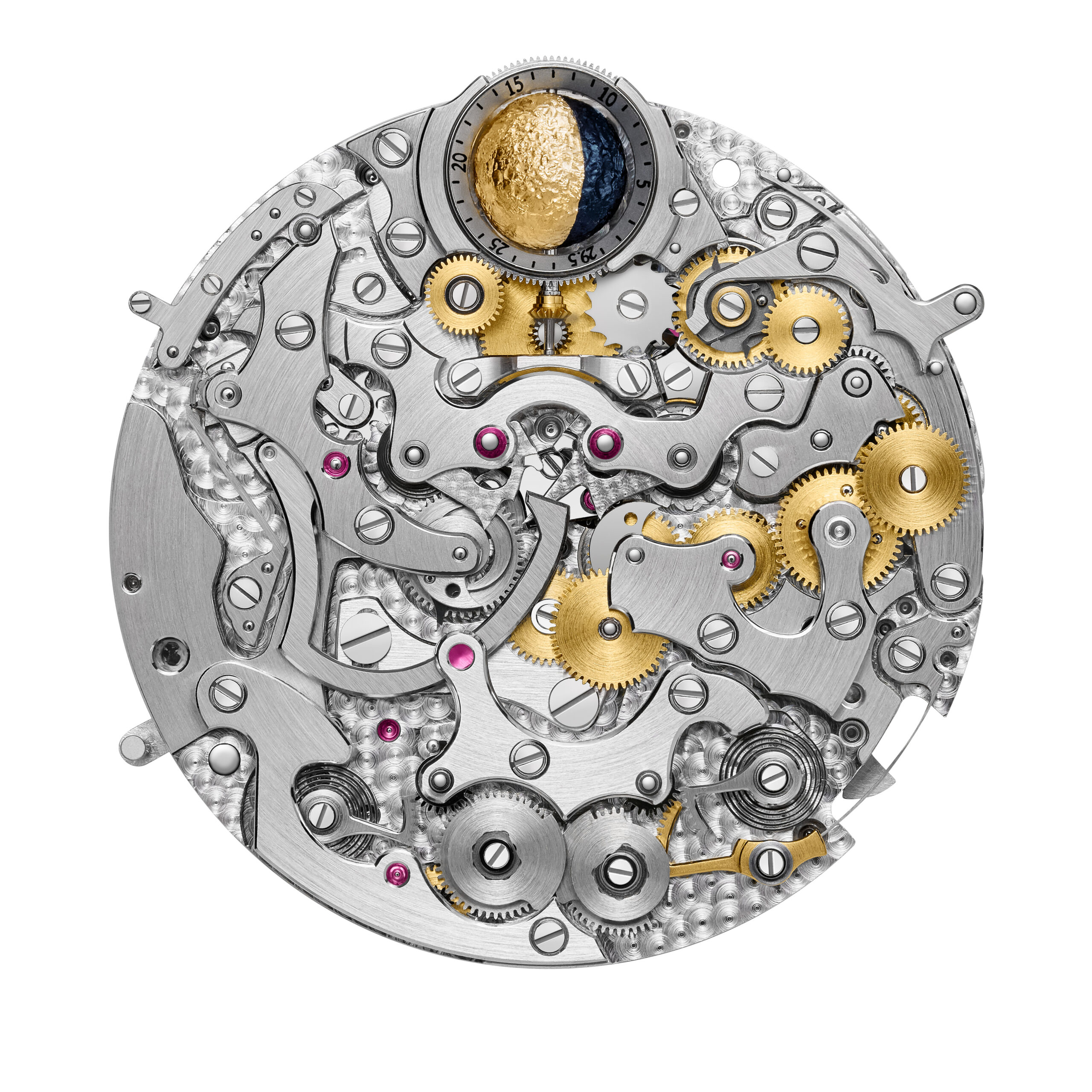 At the core lies the manually wound Calibre 3670, a movement of 512 components, certified with the Poinçon de Genève, and the subject of four pending patents. Its innovations include a governor for the retrograde displays, ensuring the bi-retrograde hours and minutes snap back in perfect unison at midnight; a sequential double power reserve display stretching across six days; and a spherical moon phase showing not only the phase itself but the precise age of the moon, correctable at any time without risk to the mechanism.
