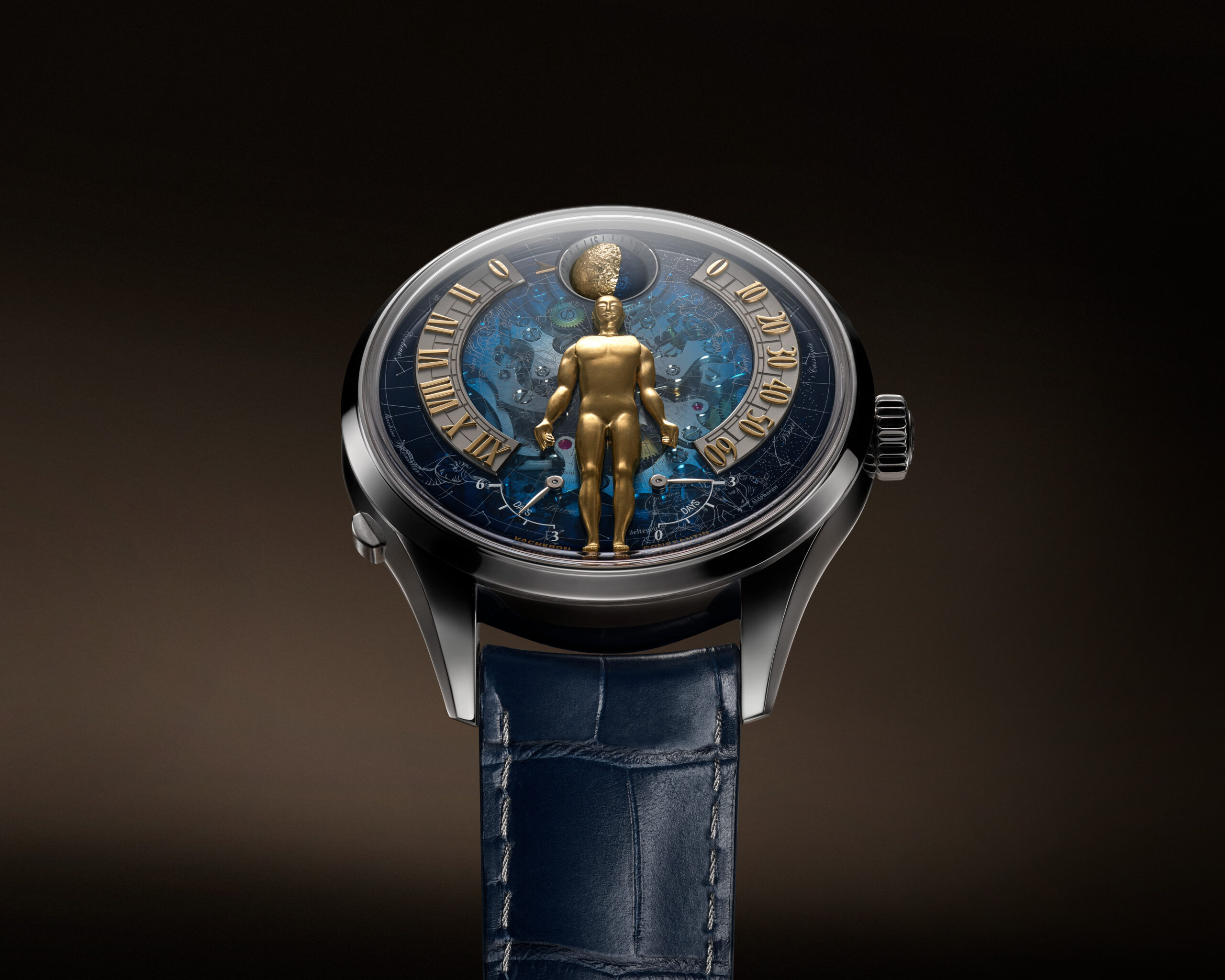 Traditional métiers d’art sit alongside modern techniques throughout this masterpiece.The front dial sets the stage with a golden titanium figure – the horological heir to the Astronomer automaton of the La Quête du Temps clock – raising its arms across twin arcs, showing hours on the left and minutes on the right. By the feet, a twin retrograde power reserve.Above the head, a moon hand-engraved in titanium, one side in golden PVD, the other dark blue. Behind the figure is depicted the night sky of Geneva as it appeared on 17 September 1755, the founding date of Vacheron Constantin. The figure’s surface patina was achieved by sandblasting titanium after a 3N yellow gold PVD treatment. The sapphire dial layers are metallised for depth of colour, and applied indexes and arcs are in white and yellow gold. Every element is hand-finished, from the engraving of the moon to the satin brushing of the movement bridges.