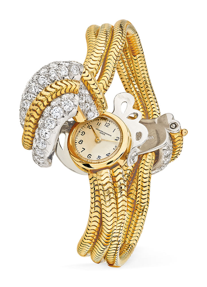 Over the years, Van Cleef & Arpels continually honed its jewelry making know-how, extending it to many of its timepieces as well. For instance, pieces from the 1950s showcased the maison’s exquisite craftsmanship with precious metals and diamond setting. One of the most distinctive aspects of all Van Cleef & Arpels creations can be seen in its gem-setting savoir-faire, so carefully and qualitatively executed that hard metals are reminiscent of the softest silk, with brilliant diamonds flowing in organic, flowing curves.