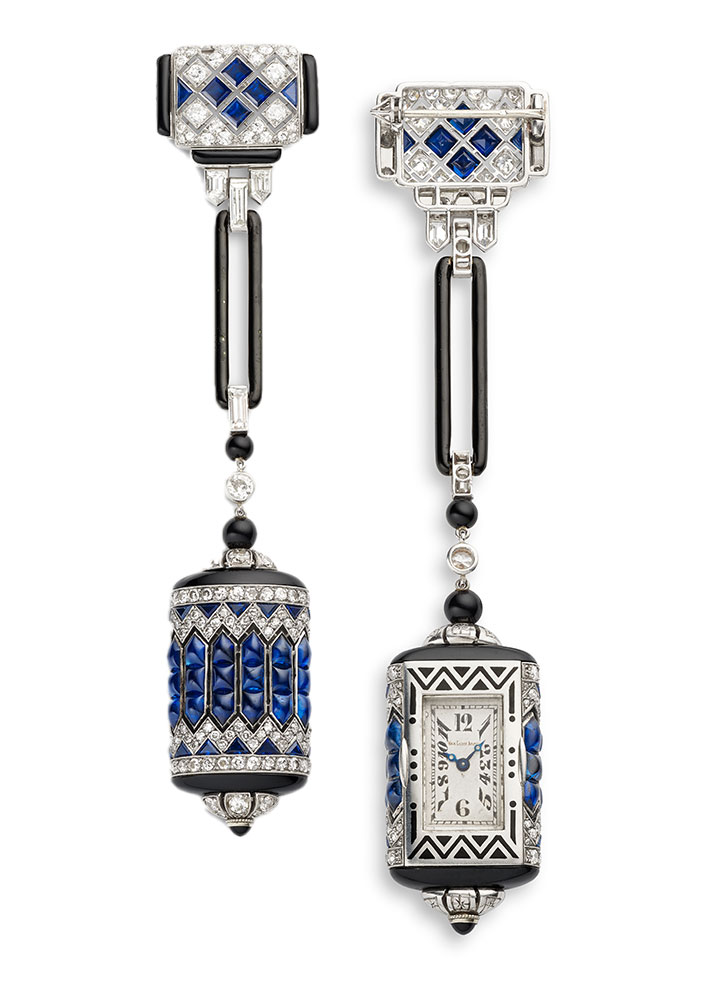 - Chatelaine watch (front and back) circa 1924 set with sapphires, diamonds and black onyx