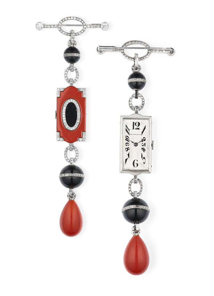 - A lapel watch in platinum, set with onyx, coral, and diamonds (1923)
