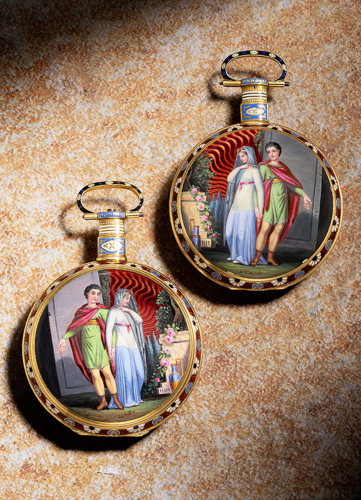 Collectors will also be drawn to a pair of ornate antique pocket watches by Edouard Juvet. Created in Fleurier specifically for the booming Chinese market of the mid-19th century, these timepieces feature exquisite enamel work depicting the legend of Titus and Berenice. Both contain key-wound movements with decorations and pristine enamel dials, and are accompanied by their original leather presentation box.