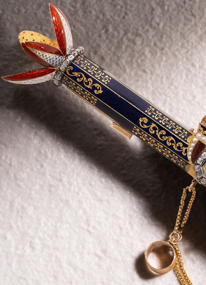 Among these treasures is an exceedingly rare flintlock pistol form perfume sprinkler watch attributed to Moulinié, Bautte & Cie. With only a dozen surviving examples known worldwide (most housed in institutions like the Patek Philippe Museum), this yellow gold piece features intricate enamel work, pearls, diamonds, and a concealed watch with a manual key-wound movement. It comes complete with its original enamelled winding key manufactured by Ragnaud a Genève.