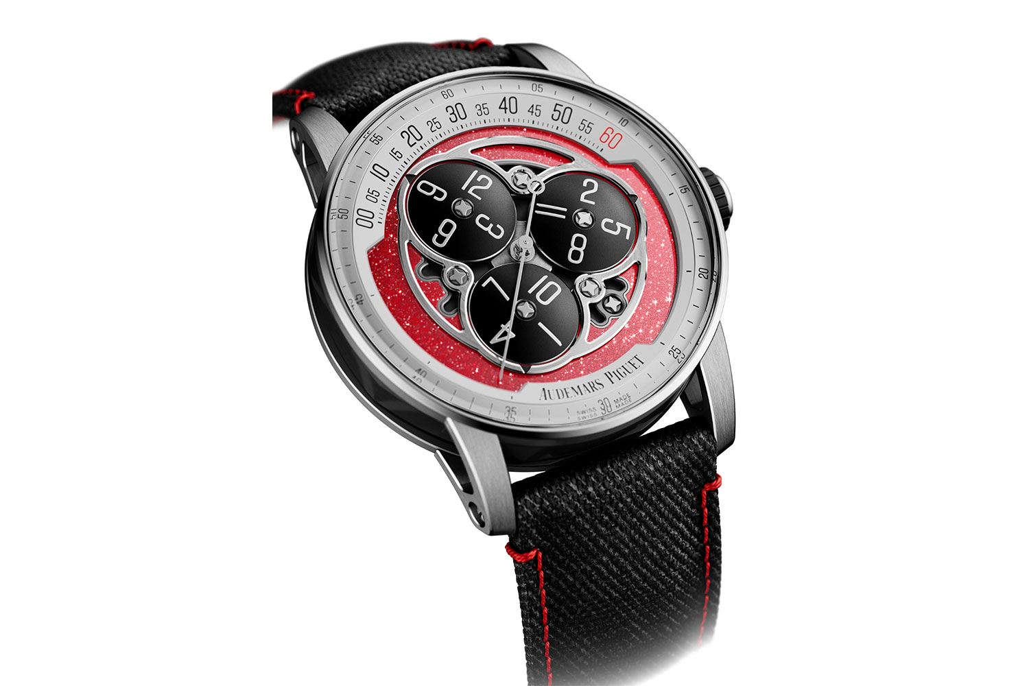 The unique Code 11.59 by Audemars Piguet Starwheel is complete with two strap options — one rubber-coated and the other in denim with red stitching