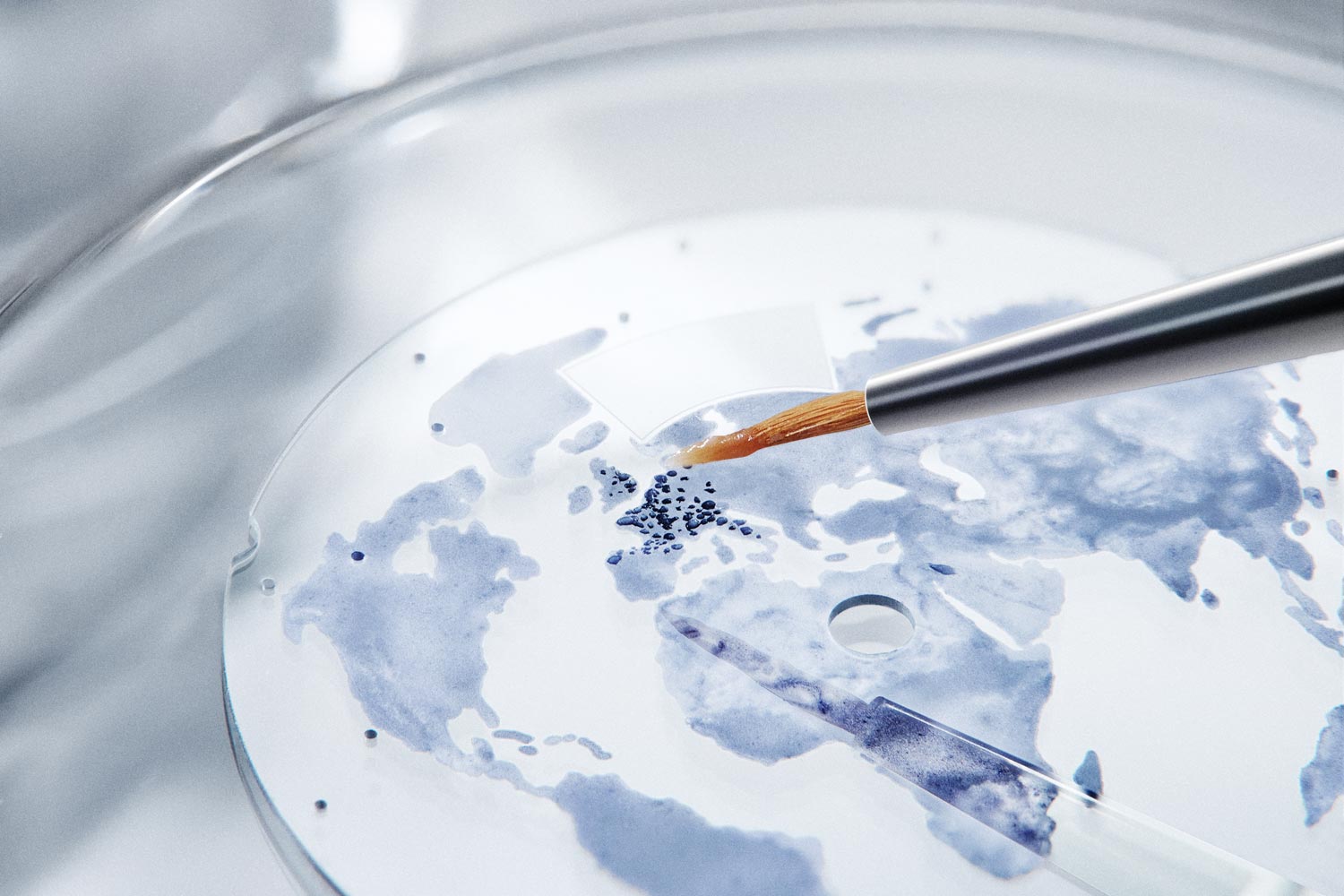 Beneath the enamelled sapphire lies the guilloché dial, dark blue in tone to evoke the ocean. It is engine-turned with latitude and longitude lines, their curves creating the illusion of a domed surface. Together with the translucent enamel disc above, the result is one of the most elaborate world-time dials in contemporary watchmaking.