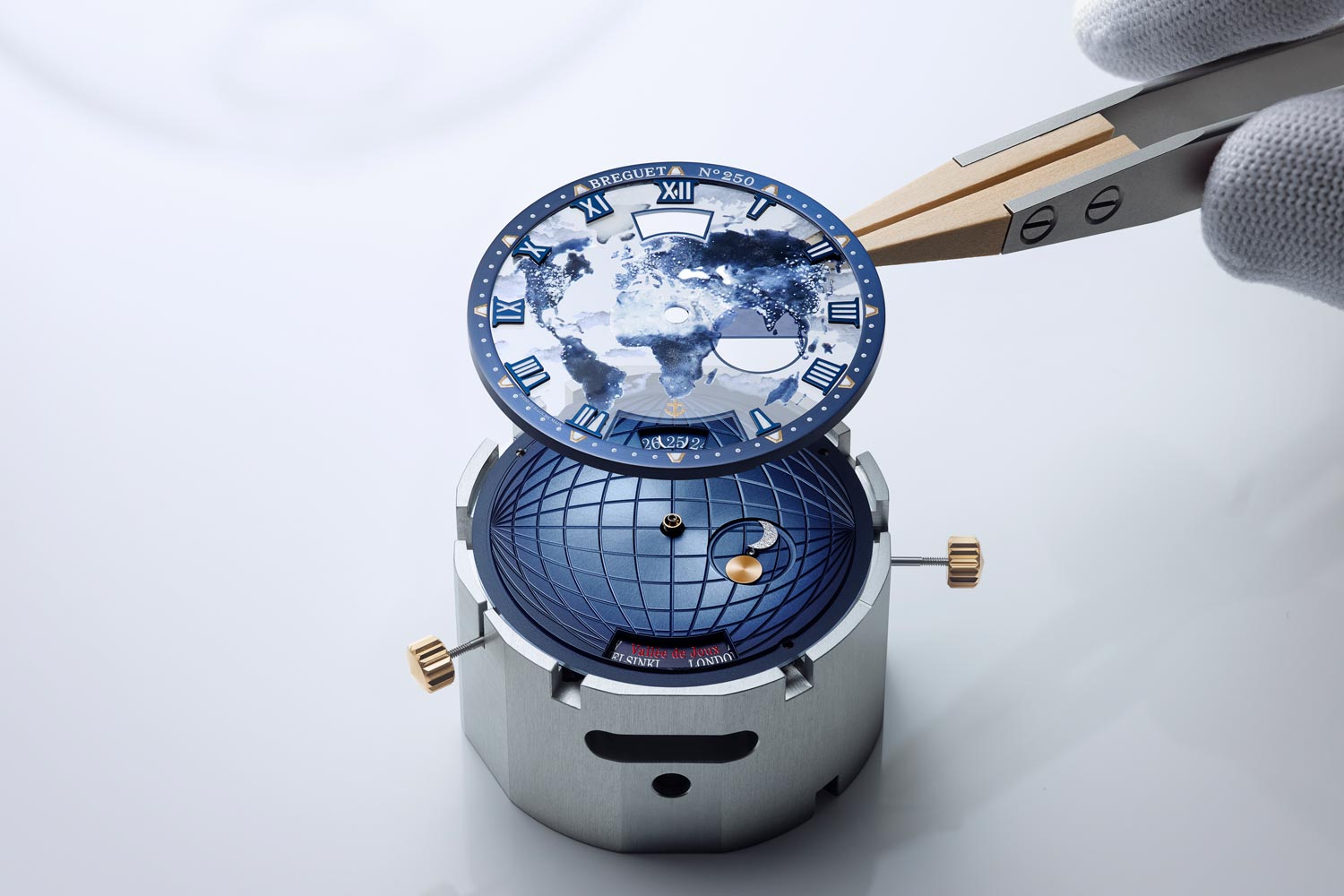The enamel is particularly unusual. Instead of the traditional method of applying enamel on a metal base, Breguet has chosen a clear sapphire disc and enameled both sides. The process begins with miniature painting of the world map on the back, followed by clouds floating above on the front. The clouds are different on each of the 50 pieces, making every dial unique in its own way. Both sides are fired at high temperature in two stages, qualifying them as grand feu enamel. Once the painting is set, it is coated with a luminescent material that allows the dial to glow in the dark, a patent-pending technique.