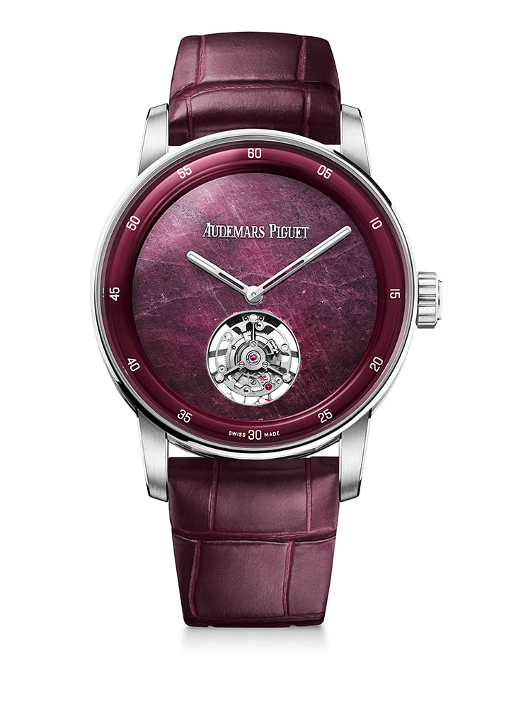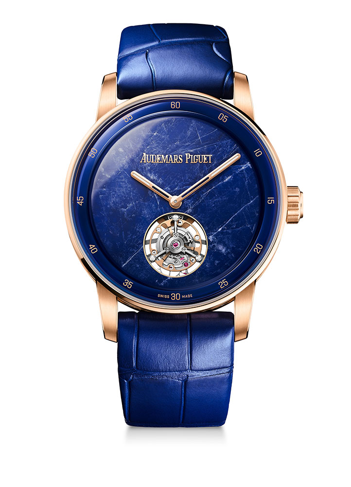 One can’t dismiss the technical feat of including a flying tourbillon in a 38mm case. Traditionally reserved for larger watches, the complication takes center stage at 6 o’clock, appearing to float above the stone dial thanks to its cage being supported only from below. The watch runs on the Calibre 2968, Audemars Piguet’s ultra-thin, selfwinding flying tourbillon movement measuring just 3.4mm thick. First introduced in 2022, the caliber uses a titanium cage with a peripheral drive for reduced weight and higher efficiency, ensuring precision while maintaining a graceful presence on the wrist.