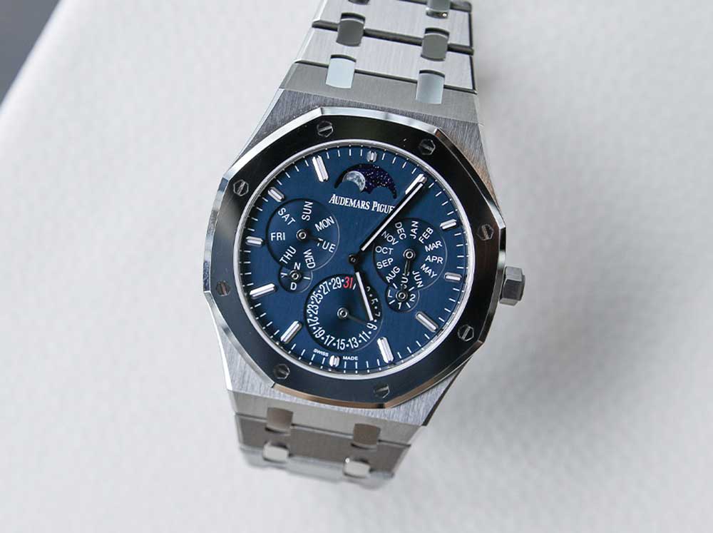 The dial does away with the tapisserie pattern and is replaced by a dark blue satin finish which is brushed vertically. The markers are now much more prominent and pop out from the watch face. Watch collector Austen Chu was the first person in the world to get the Royal Oak Selfwinding Perpetual Calendar Ultra-Thin and he tells me, “The satin dial, in my opinion, fits the watch a lot better than the tapisserie dial, and it also makes the watch look thinner on the eyes. The tapisserie pattern brings in a lot of depth. So without the tapisserie dial, it makes the watch look even slimmer.”