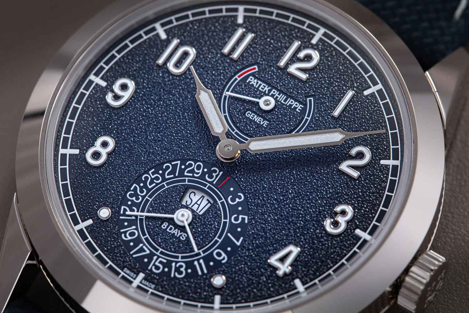 The dial is clean and symmetrical, with an appealing, well-balanced layout showing the day, date, and power reserve. The case has classic Calatrava styling, while the blue grained dial gives it a more relaxed, everyday feel.