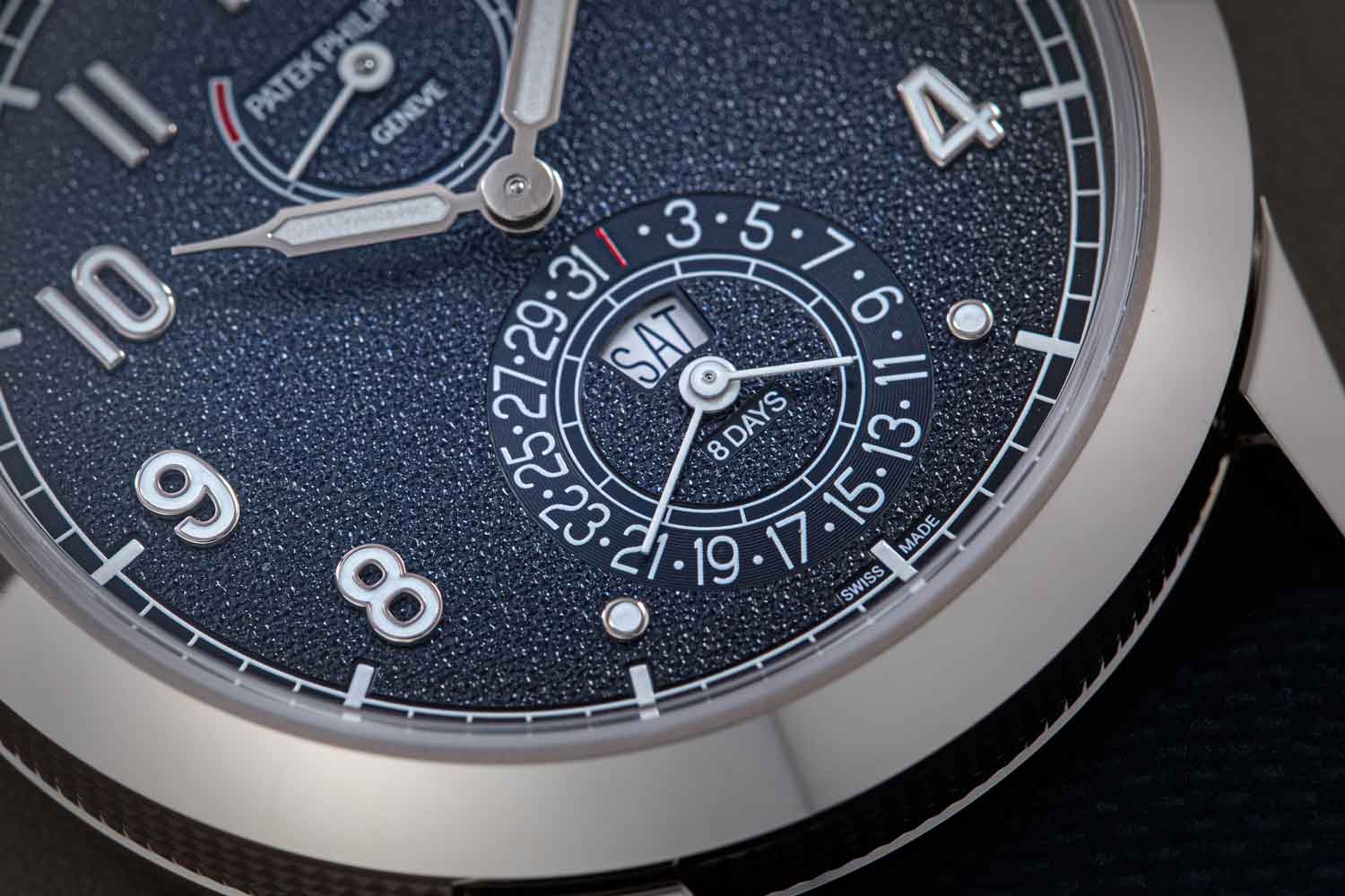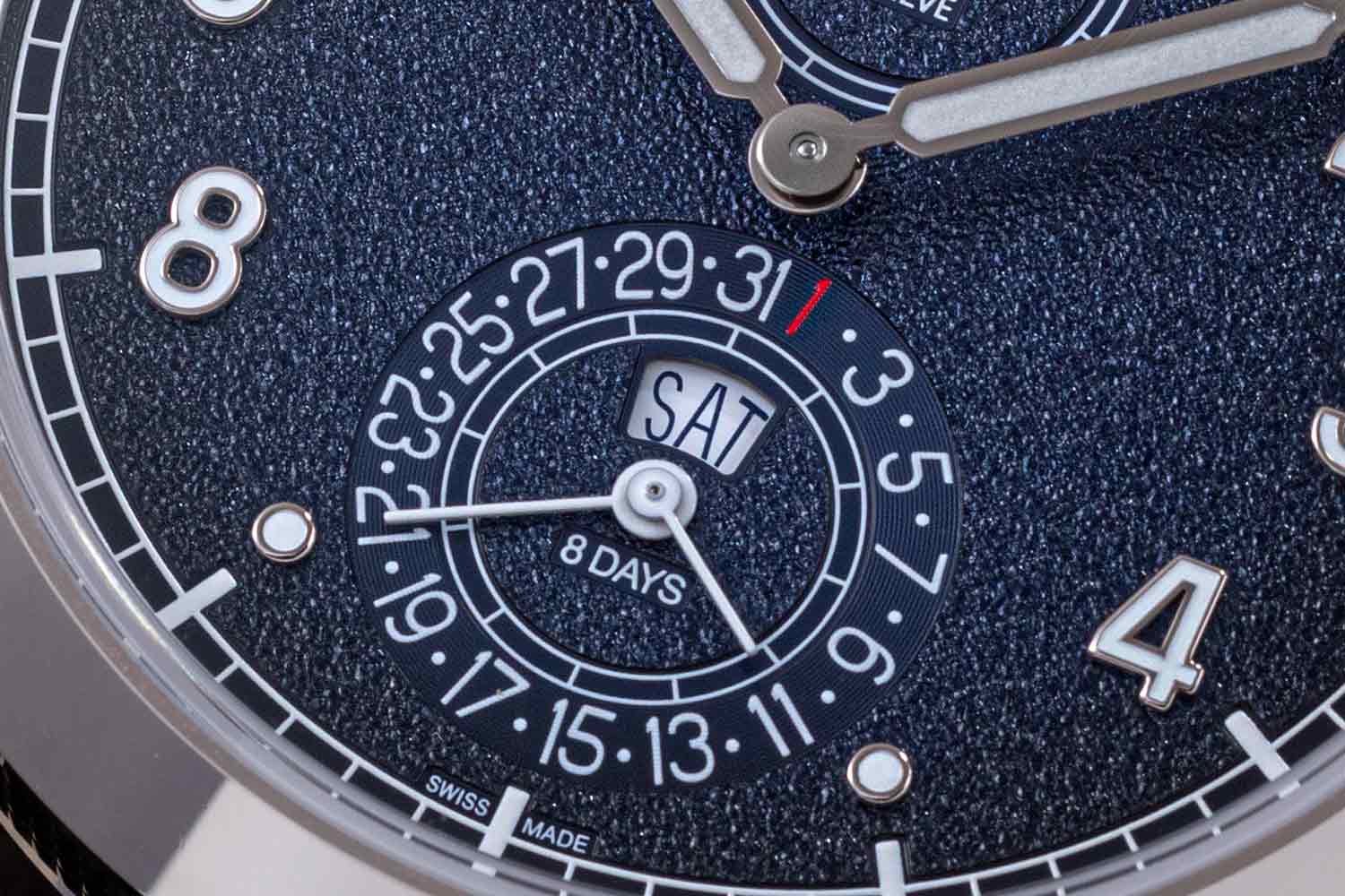 And of course, the two sub-dials at twelve and six o’clock echo the Gondolo 8-Day ref. 5200. But here the movement is new, and it’s round, not rectangular. Still, the good stuff stays. There’s the eight-day (technically nine, more on that soon) power reserve display at twelve, and the sub-seconds plus date at six. Nestling the day disc inside the same sub-dial is clever; it keeps things compact without sacrificing readability.
