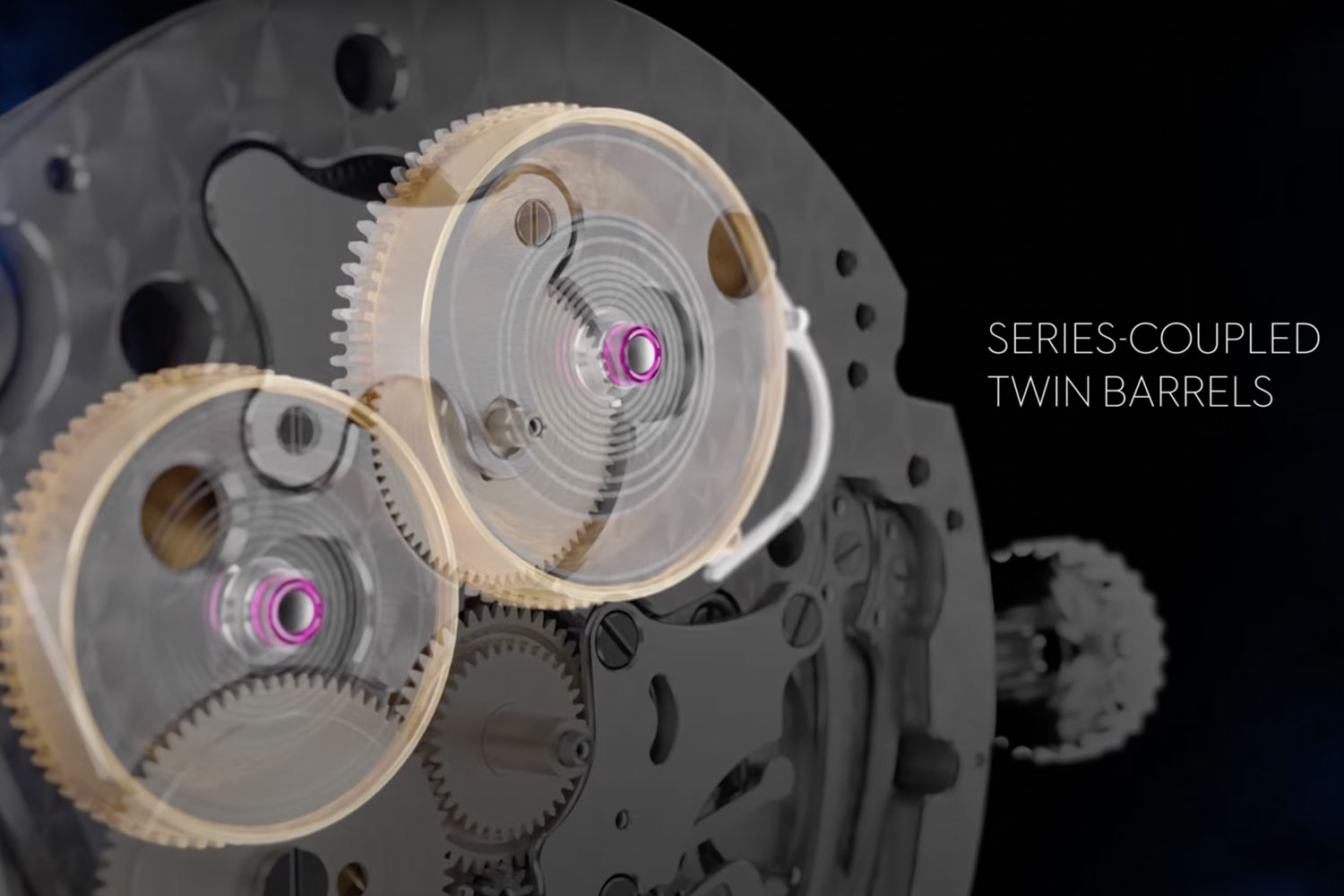 With twin barrels, each one only needs to store a shorter reserve. When they are coupled to unwind together (more on that later), they can somewhat reduce the torque difference between the beginning and end of the reserve.