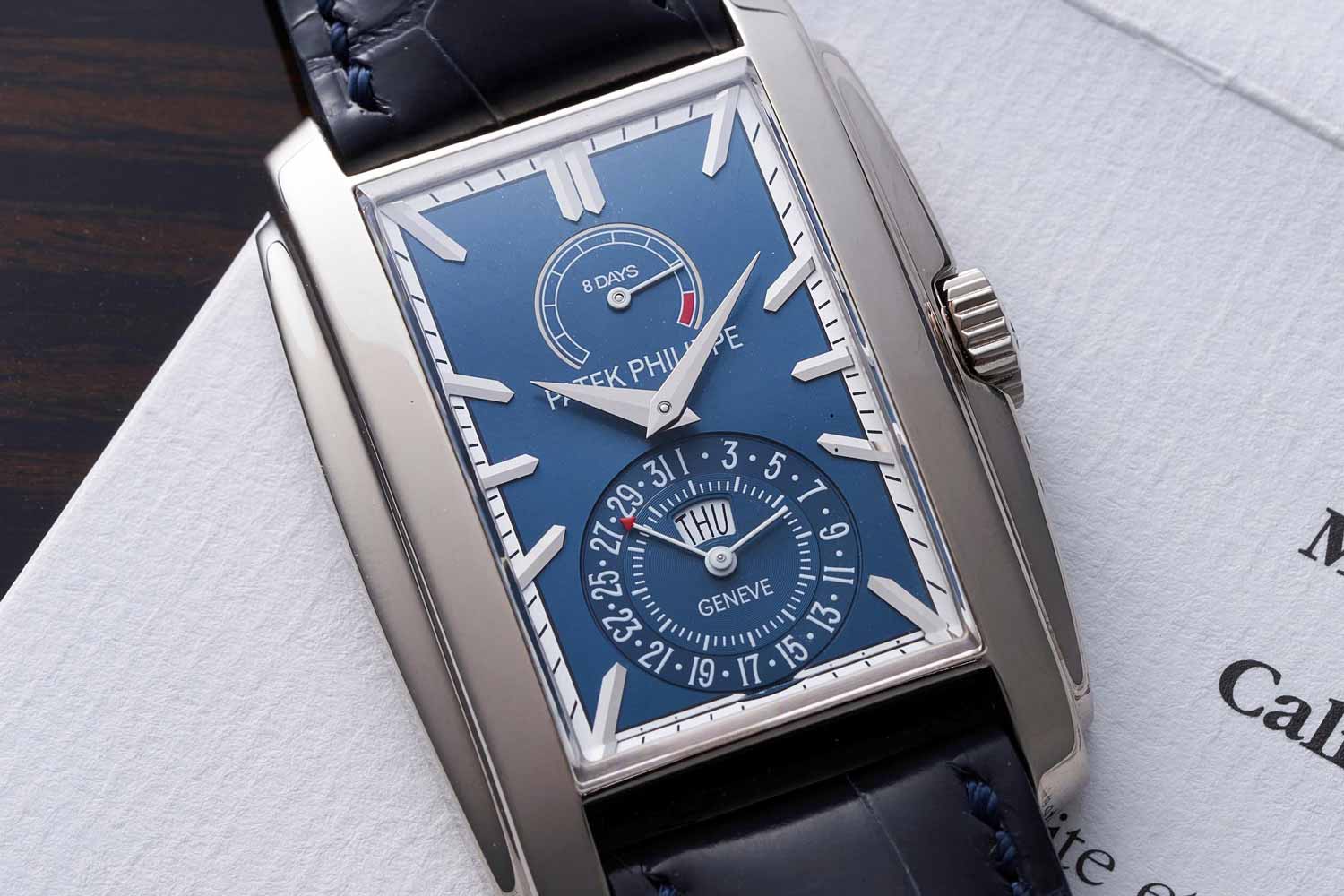 The Gondolo 8-Days ref. 5200G, with a day, date, and power reserve indicator, just like the current Calatrava 8-Day. (Image: Bonhams)