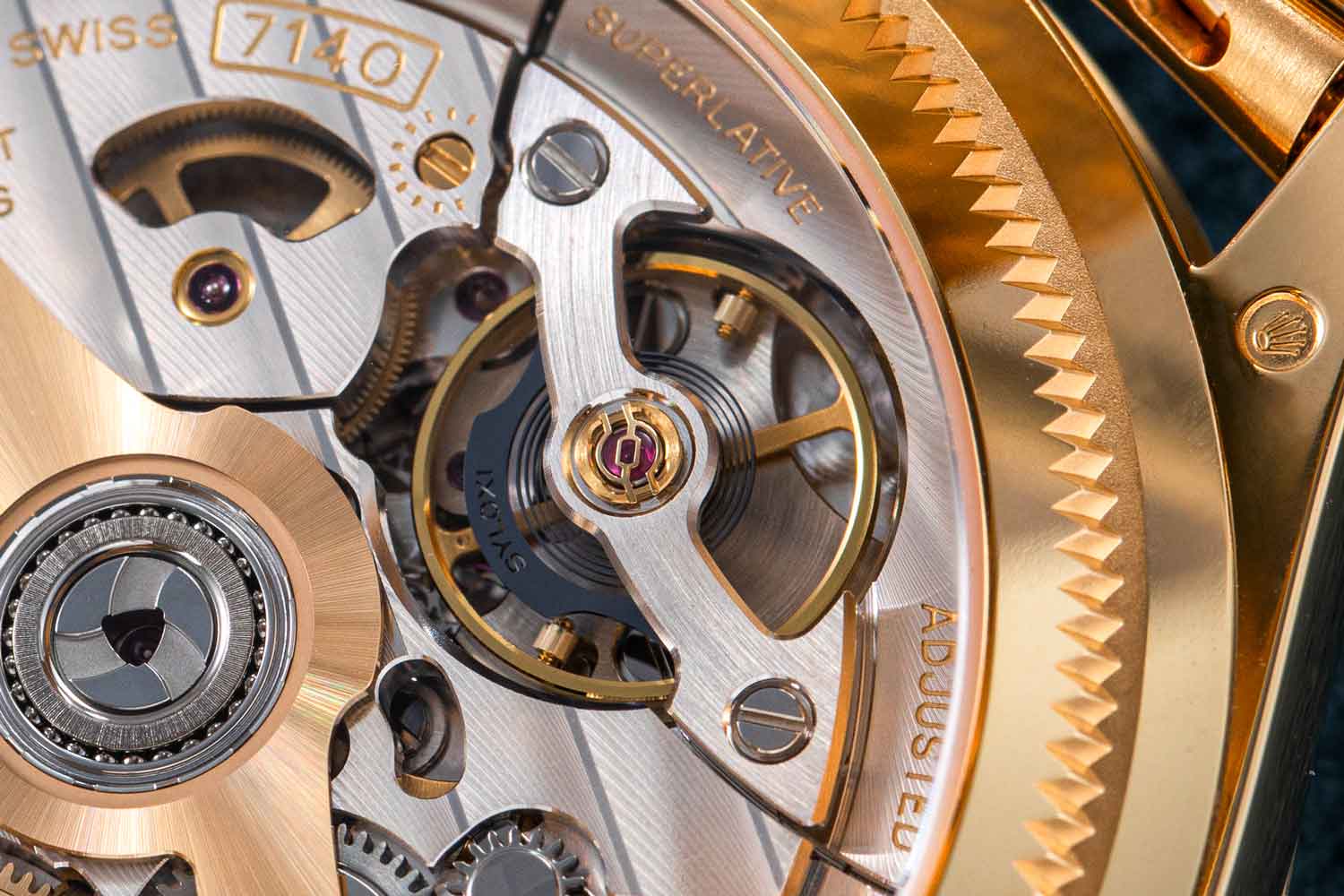 More importantly, it is finished in a way that sets it apart from the brand’s closed-case movements. The plates now carry Geneva striping, or more precisely, Rolex’s own interpretation of it, with narrow grooves between each wide stripe. There are gold chatons, spiral brushing on the gilt barrel ratchet wheel, and of course the gold rotor, all of which elevate the overall look. As for bevels, the balance bridge and its surrounding plate are finished with a more pronounced bevel, while other bridges feature a narrower edge.