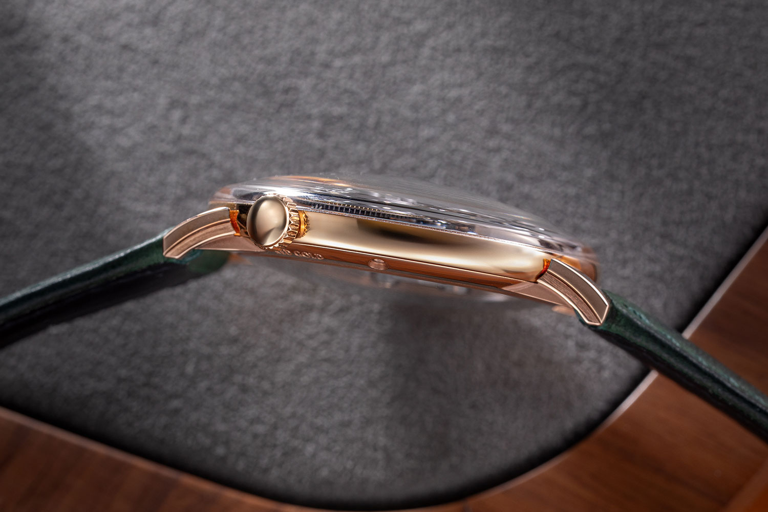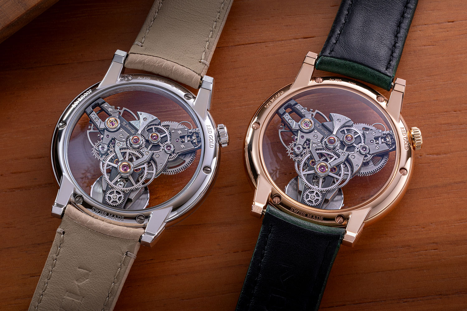 On the reverse of the watch, the crystal caseback provides a view of the remainder of the components all meticulously hand finished with satin, polished, and micro-blasted surfaces. With the barrel positioned at 10 o’clock, the crown too is moved to this position, the winding stem hidden beneath the barrel bridge. The tactile case remains smooth and pebble like, the lugs rising from the lower case rather than the upper case creating a gap between case and lugs that is barely perceptible yet adds to the floating appearance of the case.