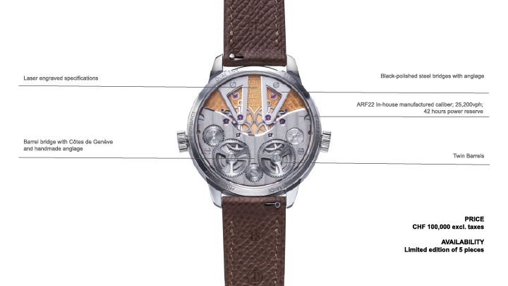- Close-up of Caliber ARF22, engraved with its specifications and marked for dual time resonance.