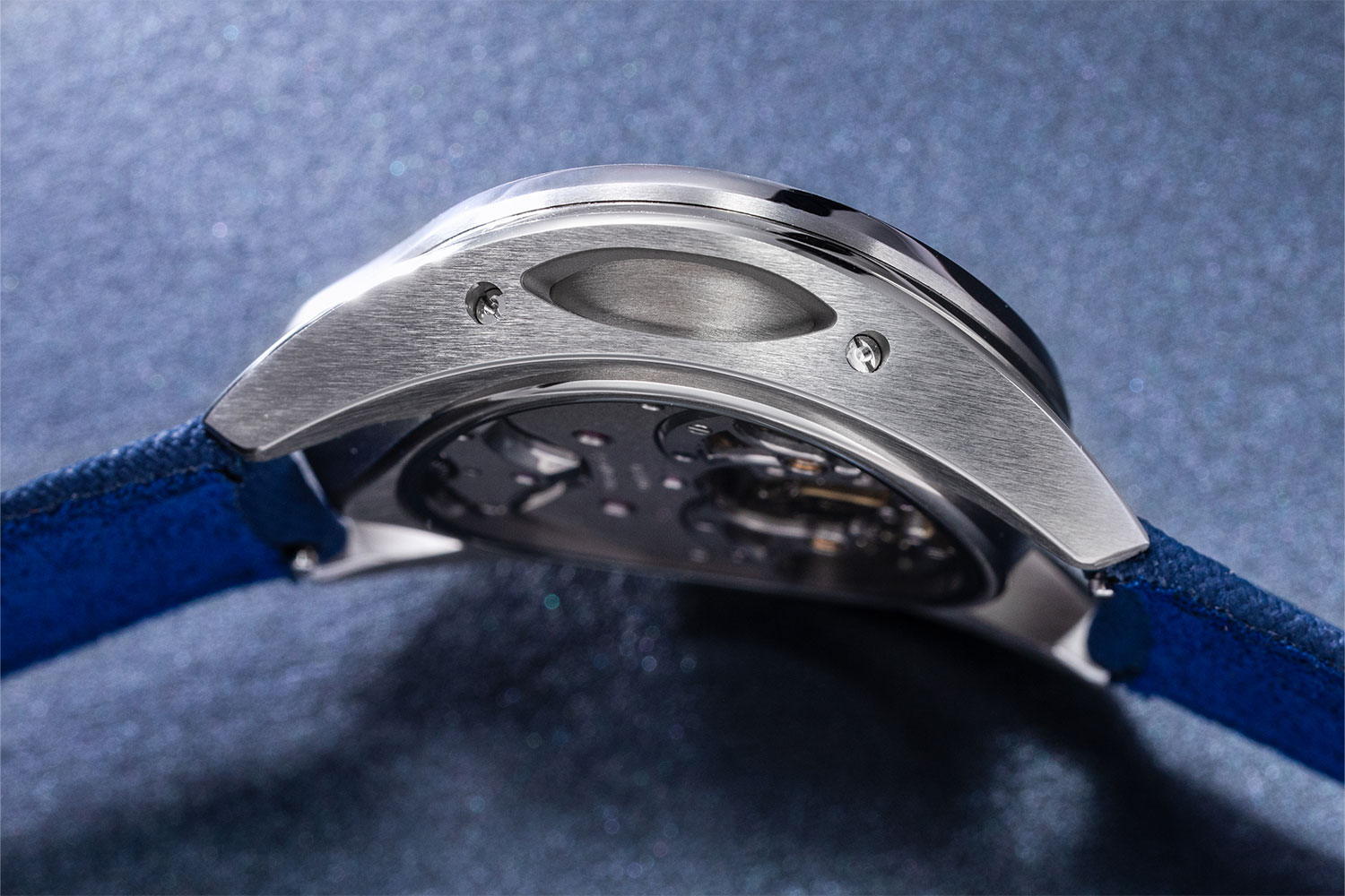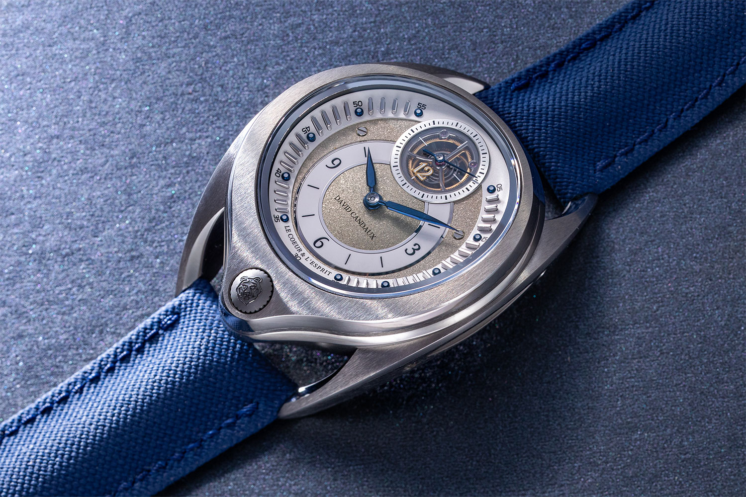 The case — 39.5mm of hand-finished Grade 5 titanium — is an ode to elegance through ergonomics. Soft, curved, seamless. Candaux’s signature retractable “magic crown”disappears at 6 o’clock, preserving the purity of form and function.