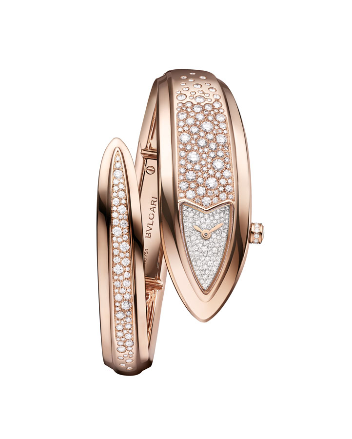 “Only a few strokes were needed to sketch Aeterna. The serpent is distilled to its essence, its own dynamic, refined to its most powerful form… with visionary modernity,” says Fabrizio Buonamassa Stigliani, Product Creation Executive Director of Bvlgari. This novelty piece made its debut across two variations. Pink gold with snow-set diamonds and white gold entirely set with diamonds including the edges of the bangle, plus a brilliant cut emerald set into the crown.