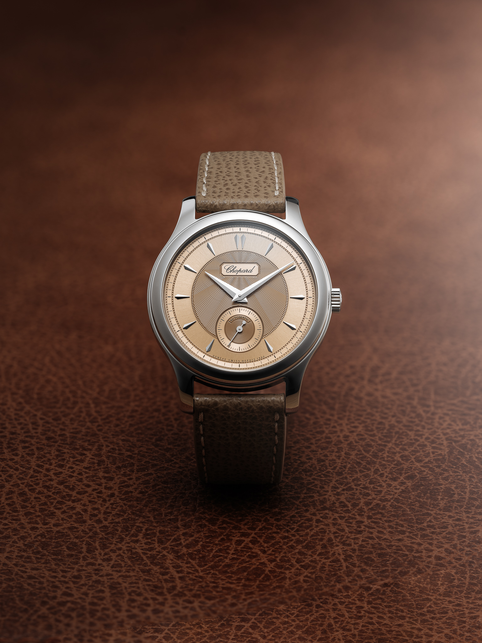 This special edition retains the same elegant proportions as the original 1997 model, with a 36.5mm “Lucent Steel” case and a time-only layout. Its 18-carat yellow gold dial showcases Chopard’s signature sunray guilloché, rendered in a sublime tone that sits between salmon and gold.