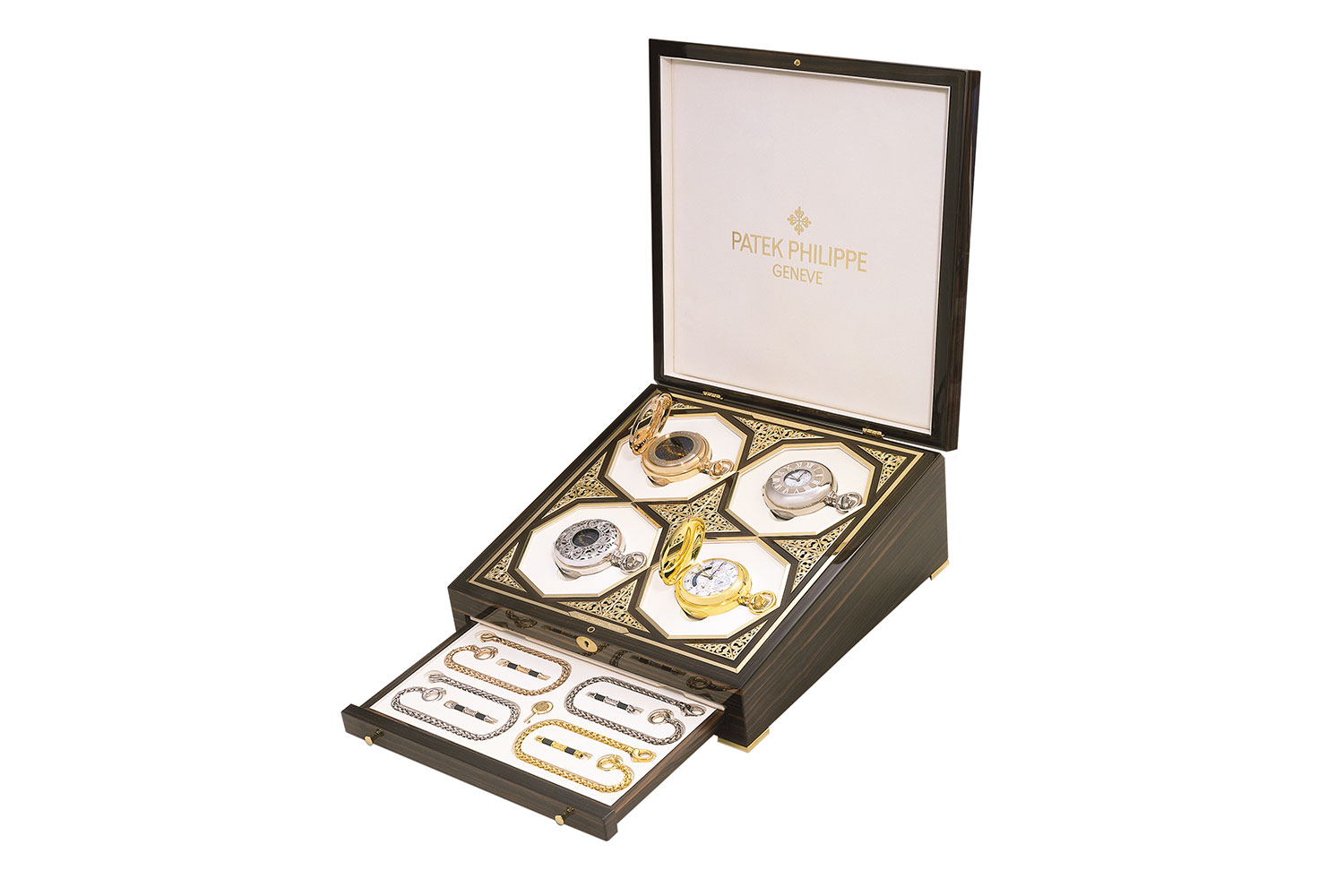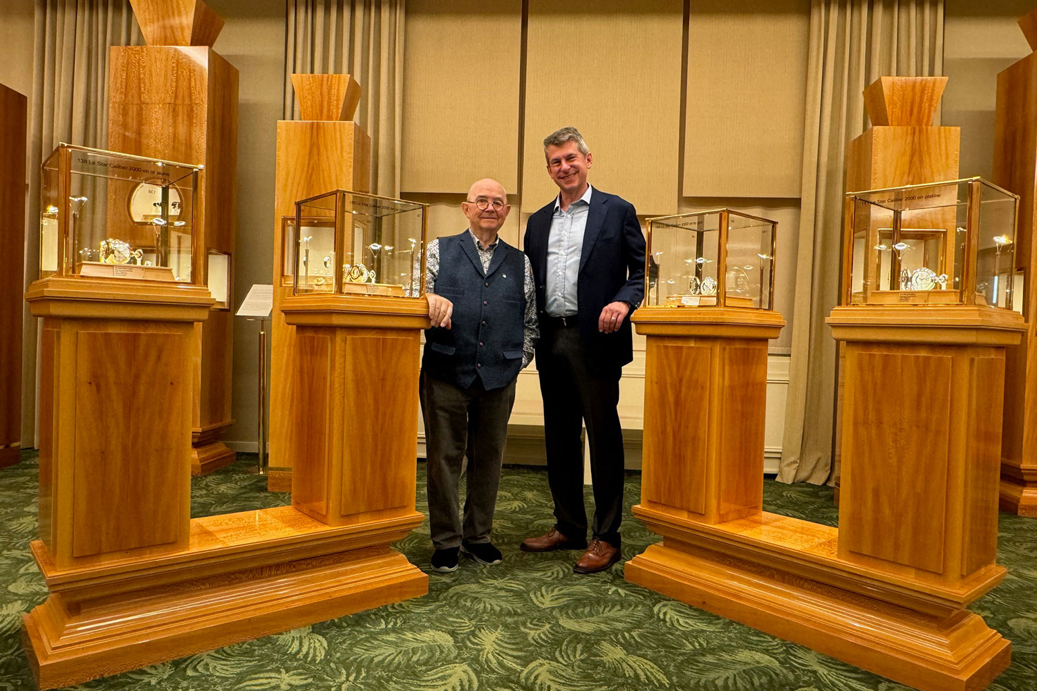 The Star Caliber 2000 was presented in five different sets of four watches, in a magnificent ebony box with applied gold engraving. Four sets consisted of pieces in 18K yellow, white and rose gold and platinum. Each of the watch cases in each set had the same engraving, but each set had its own unique design, engraved by master engraver Christian Thibert. The fifth set, made entirely in platinum, presented each watch with a different engraved motif