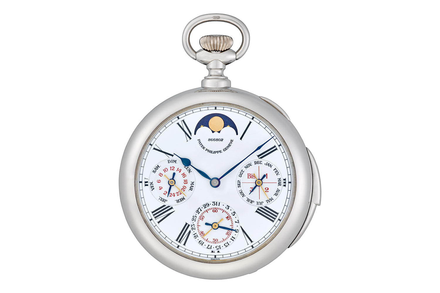 A grand complication Patek Philippe Ref. 961 pocket watch chronometer with spring detent escapement, minute repeater, moonphase and perpetual calendar in a platinum case made by JP Hagmann