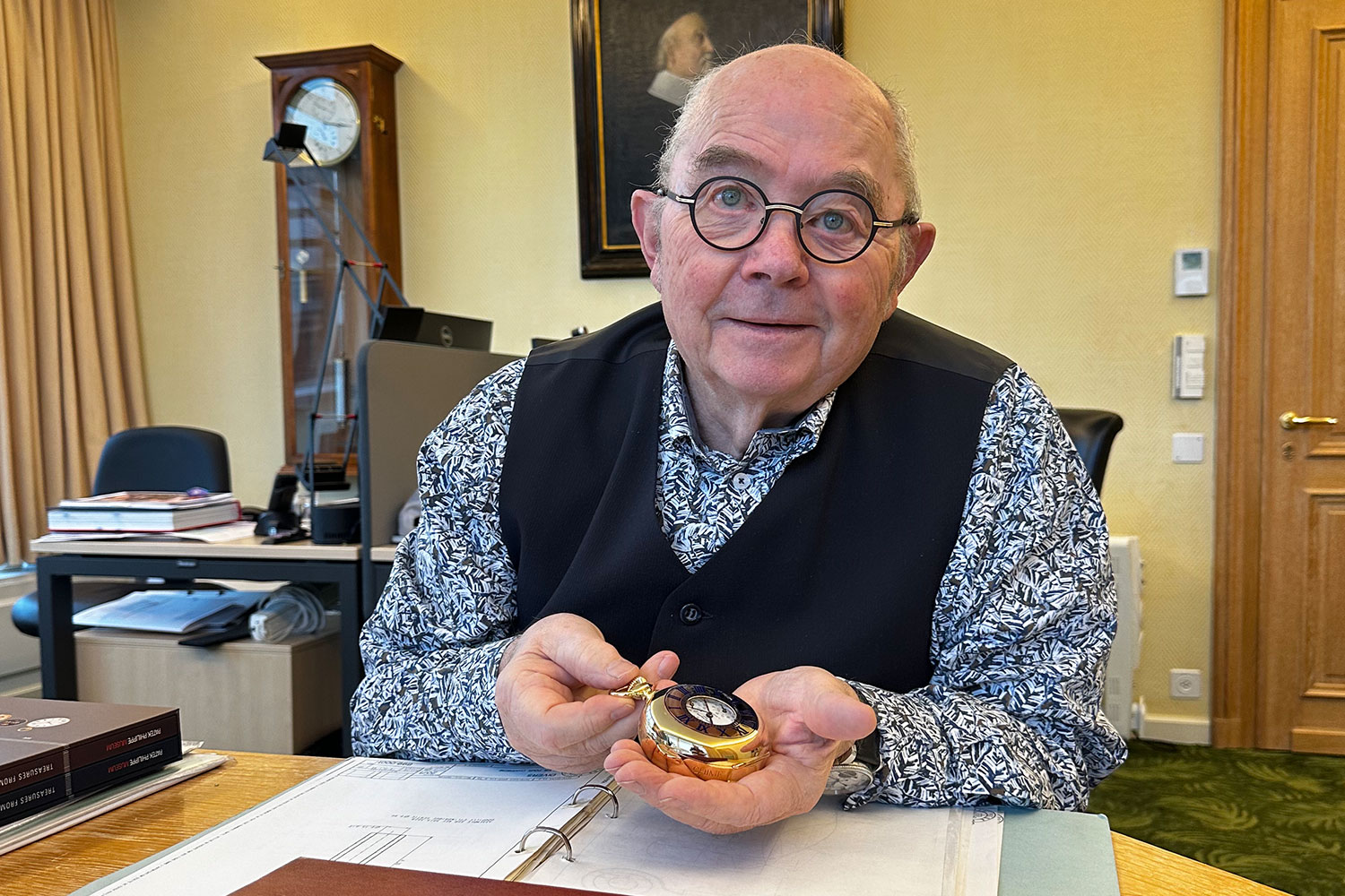 Hagmann’s magnum opus was the Patek Philippe Star Caliber 2000. It remains today one of the world’s most complicated timepieces, and thanks to its ingenious case, one of the most beautiful. Hagmann was challenged with having to produce a case which enabled each of the 21 complications to be accessed as well as the sound of the Westminster chime — a replica of Big Ben’s chime in the U.K. Houses of Parliament. To add to the difficulty, Hagmann had to make four cases in yellow, rose and white gold and platinum, plus an additional four in platinum for a special fifth set. The prototype case can be seen in the Patek Philippe Museum, ironically, a mere 10 meters from where Hagmann used to work when the building was Atelier Réunis. Hagmann developed a bassine-style half-hunter case with a sprung cover on both sides of the dial revealing as many of the dials and complications as possible. To open the cover of each side separately, Hagmann and his team at Patek Philippe developed an ingenious, patented rotating pendant system. With slight pressure, the entire pendant can be turned 180°. A Calatrava Cross indicates the side on which the cover will open. Collectability founder, John Reardon met Hagmann recently in Geneva and he told him a little-known fact that distinguishes each of his watch cases: “they all open to an angle of 82°, because this, in his opinion is the best angle to view the movement or cuvette underneath!”