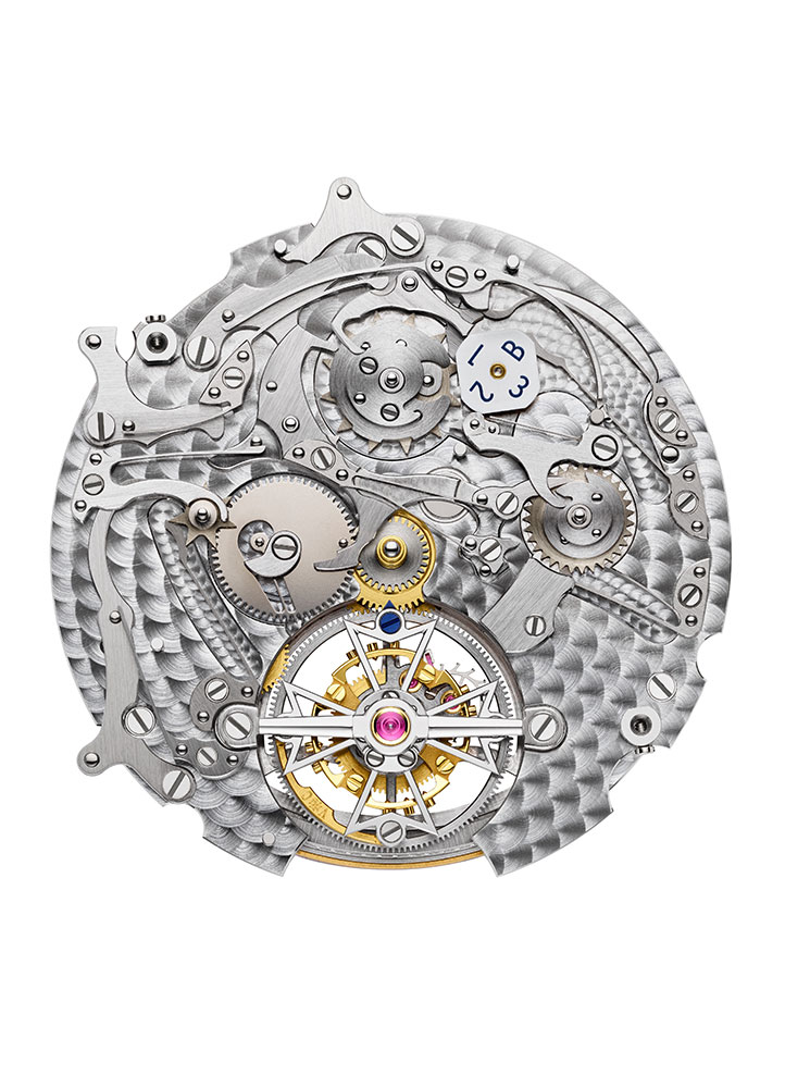 The Traditionnelle Tourbillon Perpetual Calendar is cased in platinum, while the dial is solid gold which has been engine-turned with a complex geometric motif specially developed for the anniversary. Additionally, the movement bridges have been decorated with a more intricate variation of striping that Vacheron refers to as ‘côte unique’. It is a traditional technique used by Vacheron more than a century ago and was rediscovered in 2021. Unlike conventional Geneva stripes, these are thinner, subtly curved. As such, achieving a seamless and continuous line across three bridges in this instance requires exceptional skill and a high degree of coordination between tool and touch.