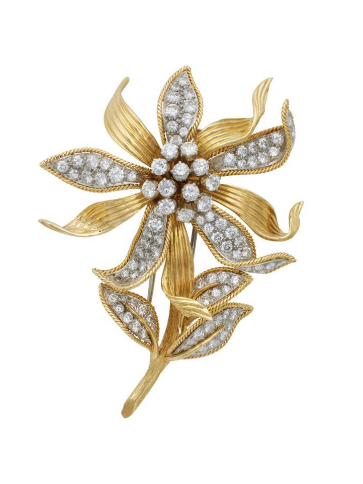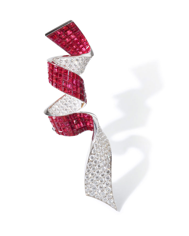 Then there are lapel pins, bar pins, jabot pins as well as double clips, all of which offer multi-wear options. Art Deco-styled brooches are particularly well suited for men. “That’s one of the great beauties of a brooch,” adds Everett. “It’s really a sculpture in precious metals and gemstones. It does not have to fit a wrist or dangle from an ear, or around the neck. It’s just a sculpture, and I think it’s the truest art form for the jeweler.”