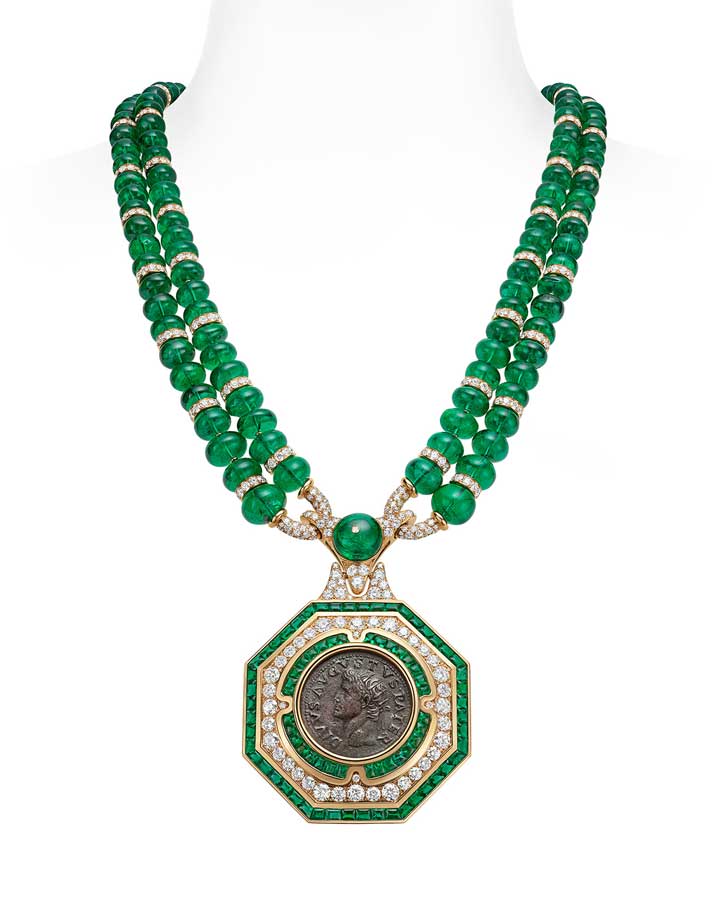 Also typical of Bvlgari high jewelry is the Serpenti in all forms, shapes and colors. Lending its gorgeous sinuous form to necklaces, bracelets and rings, it is without any doubt the most recognizable icon of the maison. Next to the Serpenti, the Tubogas also ranks high among Bvlgari jewelry collectors, evoking a mystical allure reminiscent of Egyptian royalty. When interpreted in a high jewelry collection, Bvlgari often enhances the Tubogas design with exceptional gemstones or antique coins as seen in the Monete collection.