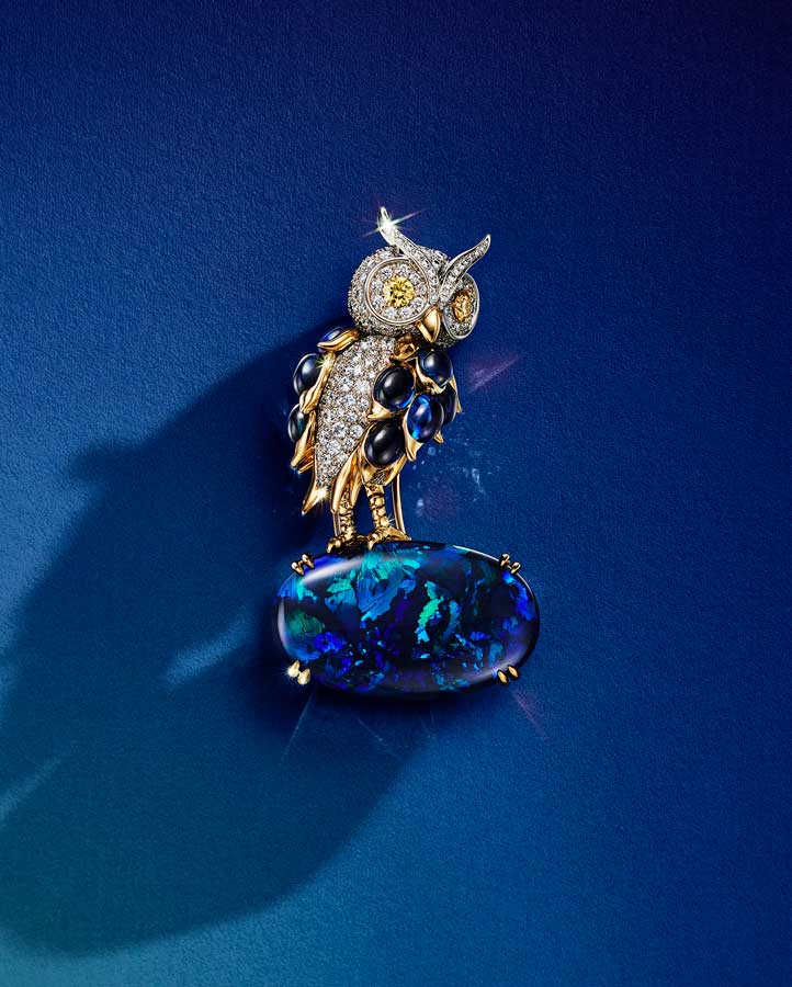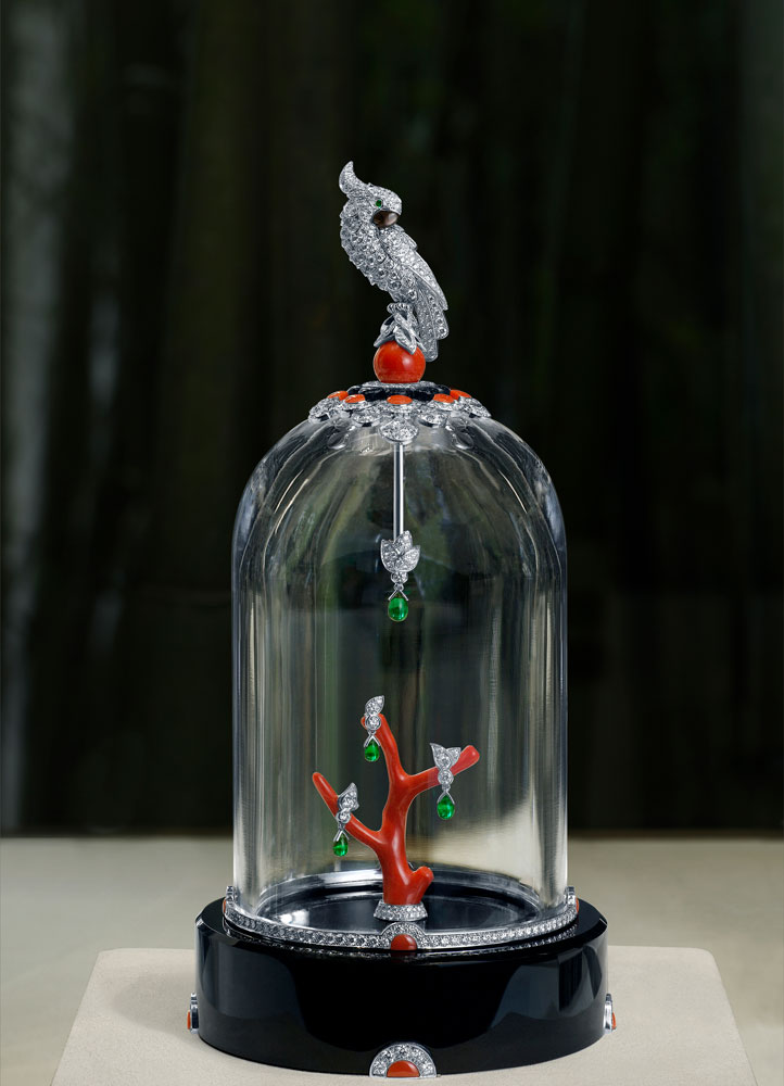Crocodiles and caimans frolic amid verdant emeralds; tigers and panthers prowl along rows of vividly colored gemstones; zebras and elephants ebb and flow with diamonds; a flamingo nestles among riveting blue and green stones, perched atop a single 38.5-carat emerald-cut aquamarine, instantly recalling the iconic Duchess of Windsor brooch of 1940; and a cockatoo interpreted as a symbol of freedom, stands atop a crystal bell, subtly recalling the iconic Freedom brooch of 1944.