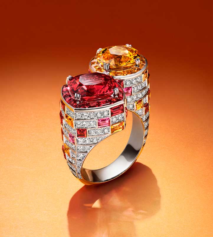 With its sprawling panoramas bursting with bright colors, scenic alleyways and lush tropical greenery, the beautiful city inspired the creation of four high-jewelry sets, each with a signature aesthetic and distinctive color palette derived from a plethora of precious stones. Australian opals, Tanzanian spinels, Colombian emeralds and Sri Lankan sapphires, to name but a few, juxtaposed with colorless diamonds, rock crystal, and even ornamental stones such as lapis lazuli which is native to South America. The Maison FRED signature Hero Cut diamond makes a stylish reappearance in this collection, set in a dazzling diamond and blue sapphire pavé ring.