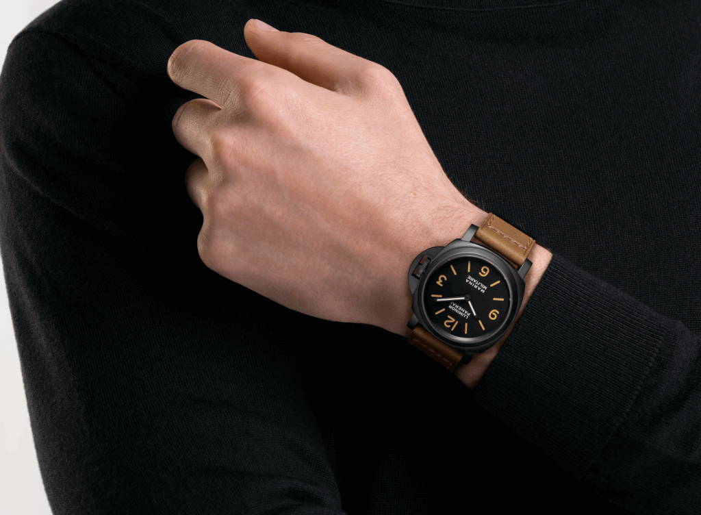 This new watch is the first time the brand has reinterpretated Panerai’s progenitor in this form — a more contemporary 44mm case, rather than the hefty 47mm models of yore. While the size may be slightly smaller, there’s no downplaying the impact of the fundamental design, the black DLC-coated Luminor case is truly one of the most important silhouettes of the modern era, responsible for shepherding in the trend to big watches in the 90s and early 2000s. On top of that, the pared-back dial aesthetics is Panerai at its minimal best, with numerals and hands in mismatched colours, a nod to the fact that the tritium lume on the dial of early models aged differently to the hands, due to a reaction with the dial varnish. Speaking of dials, this is not the original sandwich-style dial, but rather a monolayer hollowed dial, one of the few concessions to contemporary production techniques. Another is the movement — the original models used a Unitas base, while here we get the in-house hand-wound P.6000 calibre, offering a solid 72 hours of power.